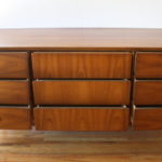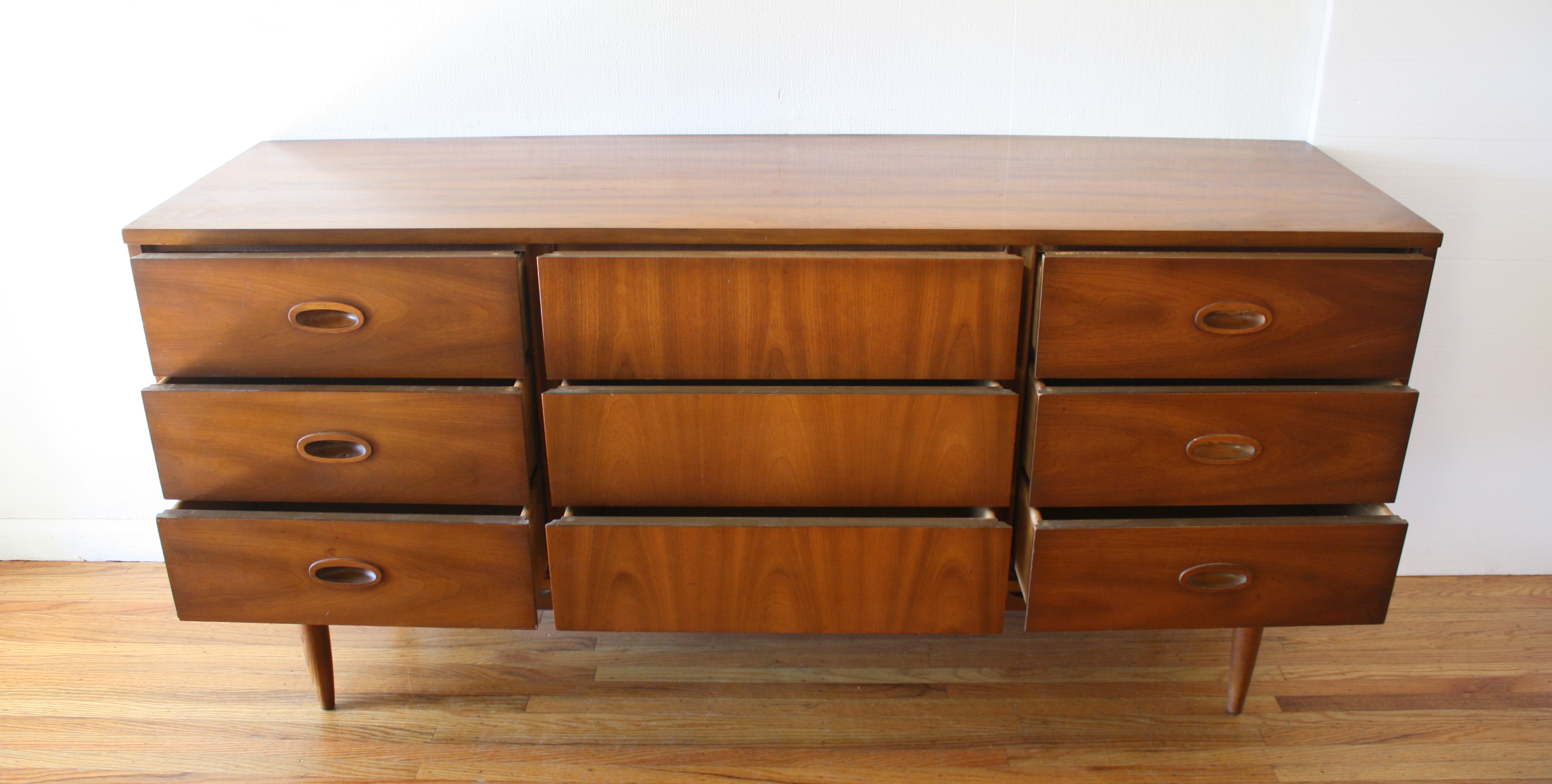 Mid Century Modern Low Dresser Credenza by Dixie This is a mid century modern low dresser credenza by Dixie. It has 9 dovetailed drawers with curved and streamlined drawer pulls, an arched base, and tapered legs. Dimensions: 64″W x 18.5″D x 30″H. *SOLD*