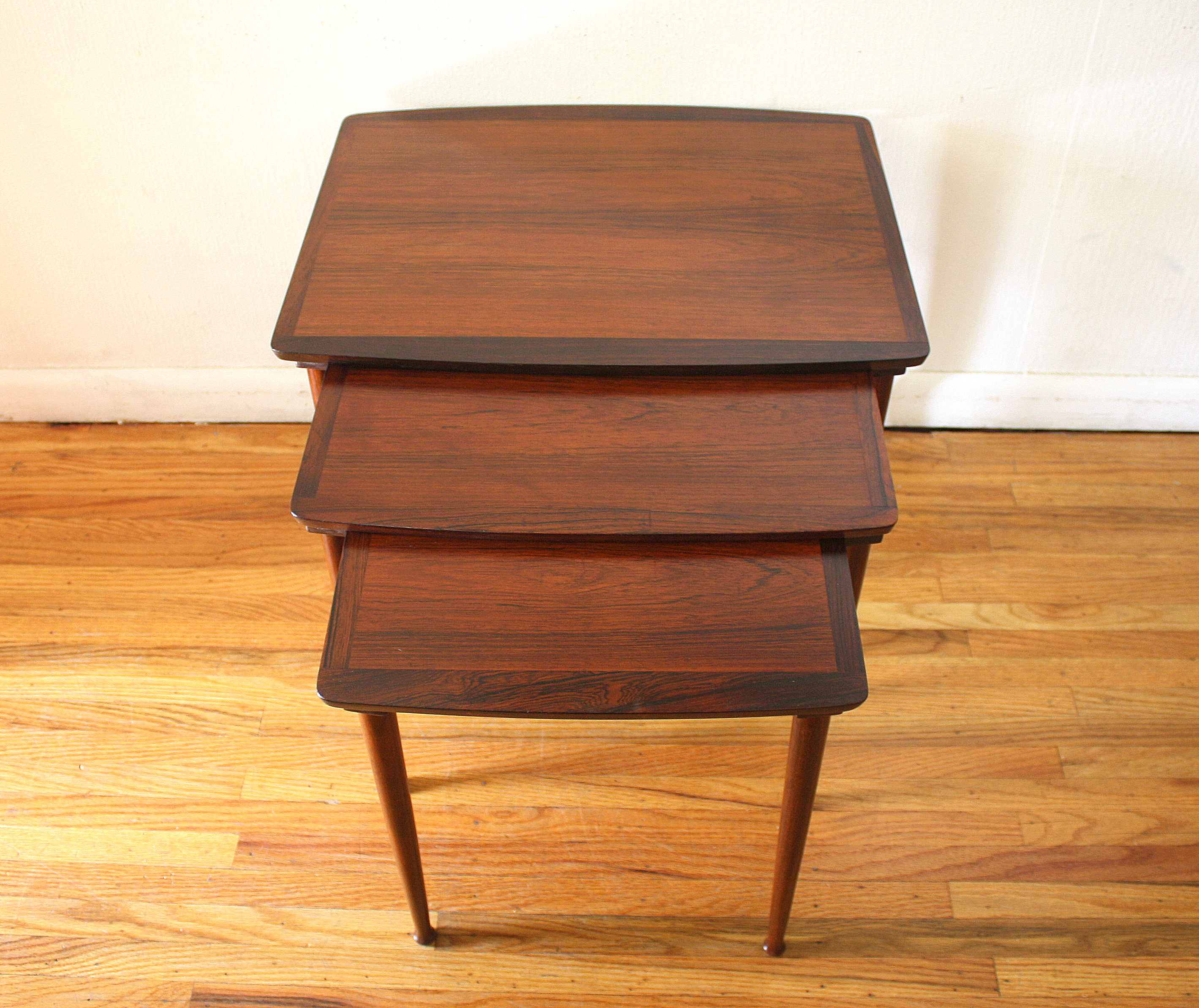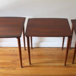 This is a set of 3 mid century modern nesting tables.  The tables are made of beautiful rosewood and have slender tapered legs.  Dimensions: Large: 22″W x 17″D x 17.5″H, Medium: 18″W x 15″D x 17″H, Small: 15″W x 14″D x 16.5″H.