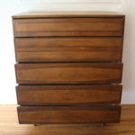 This is a mid century modern tall dresser by American by Martinsville. It has a 5 dovetailed drawers with a streamlined drawer design, tapered legs, and a beautiful wood grain. Dimensions: 40″W x 18.5″D x 46″H.