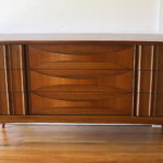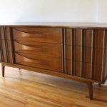 Mid Century Modern Low Dresser Credenza by United This is a mid century modern low dresser credenza by United. It has 9 dovetailed drawers with their signature sculpted drawer design, convex pulls, and tapered legs. Dimensions: 64″W x 19″D x 30.5″H. *SOLD*