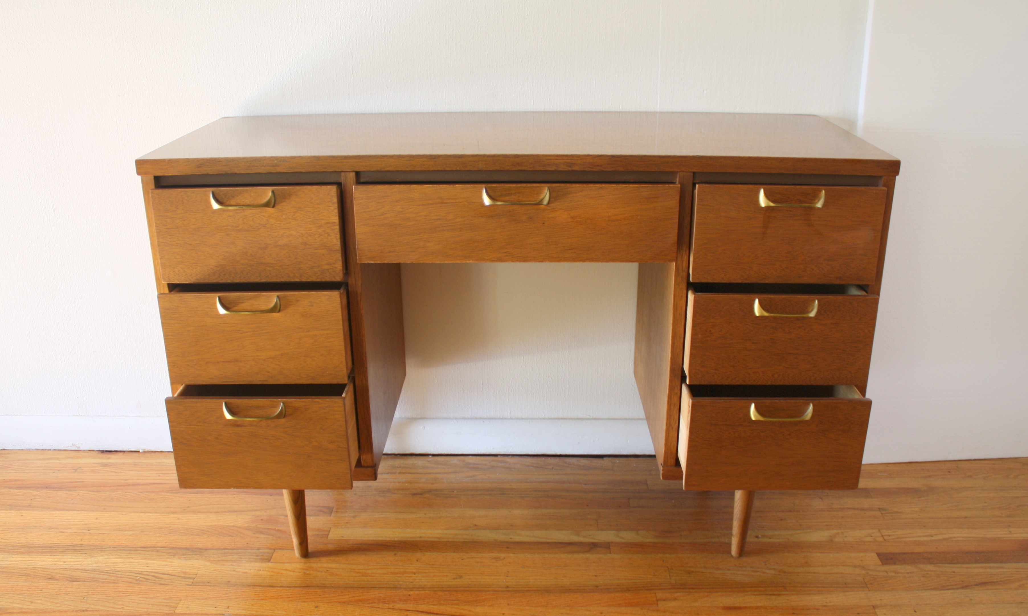 Mid Century Modern Desk This is a mid century modern desk with a keyhole design, 7 dovetailed drawers with sculpted brass handles, and tapered legs: 46″W x 18″D x 30″H. *SOLD*