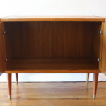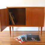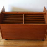 These are 2 mid century modern Scandinavian record holders. The first is a teak rolling rack, designed by Rolf Hesland for Bruksbo, made in Norway. It has 12 open slats to store records or magazines:27″W x 14″D x 17.5″H. The second is a teak record cabinet with brass tipped tapered legs, made in Denmark: 33″W x 15.5″D x 28″H. The(Records not included.)