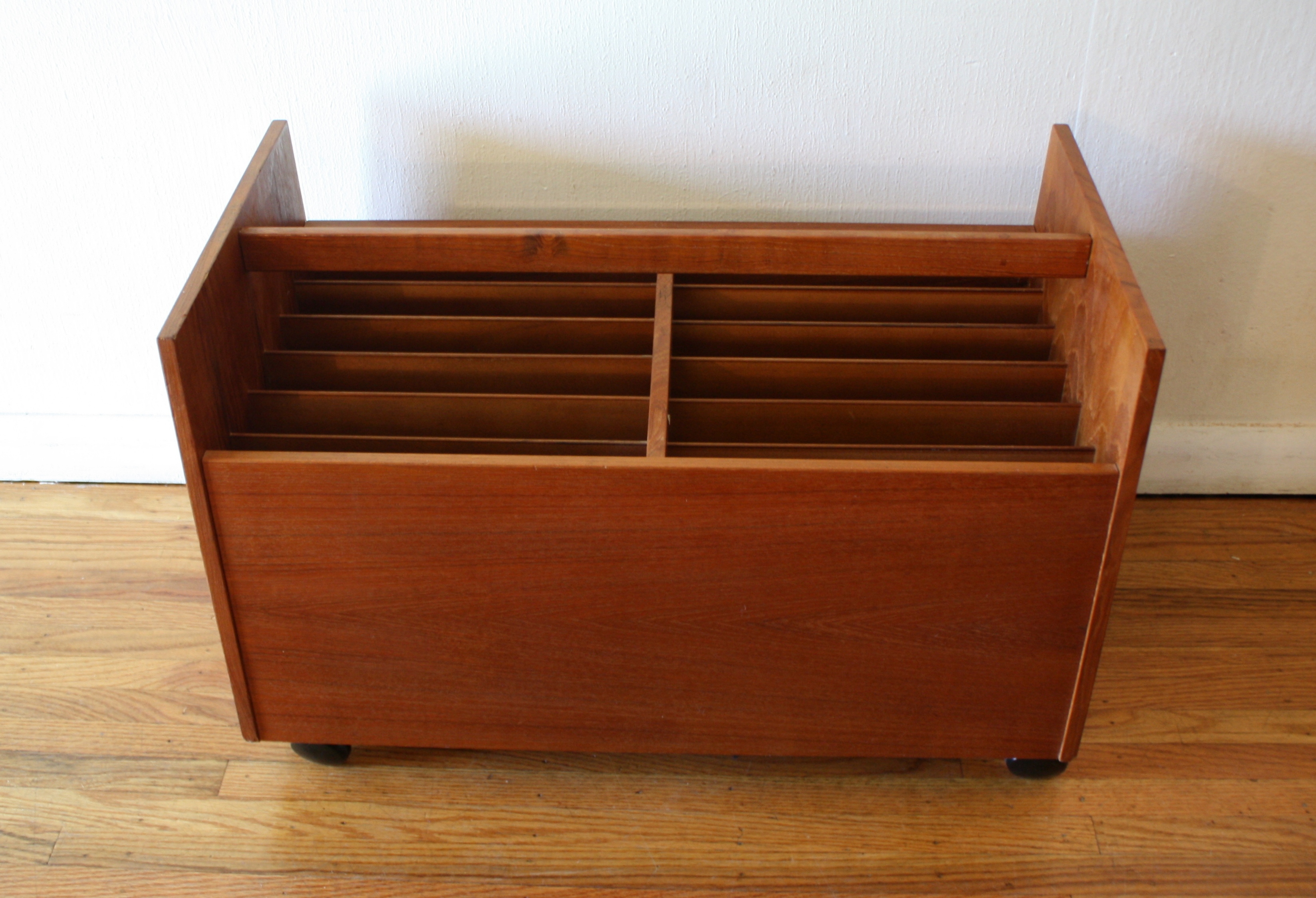These are 2 mid century modern Scandinavian record holders. The first is a teak rolling rack, designed by Rolf Hesland for Bruksbo, made in Norway. It has 12 open slats to store records or magazines:27″W x 14″D x 17.5″H. The second is a teak record cabinet with brass tipped tapered legs, made in Denmark: 33″W x 15.5″D x 28″H. The(Records not included.)