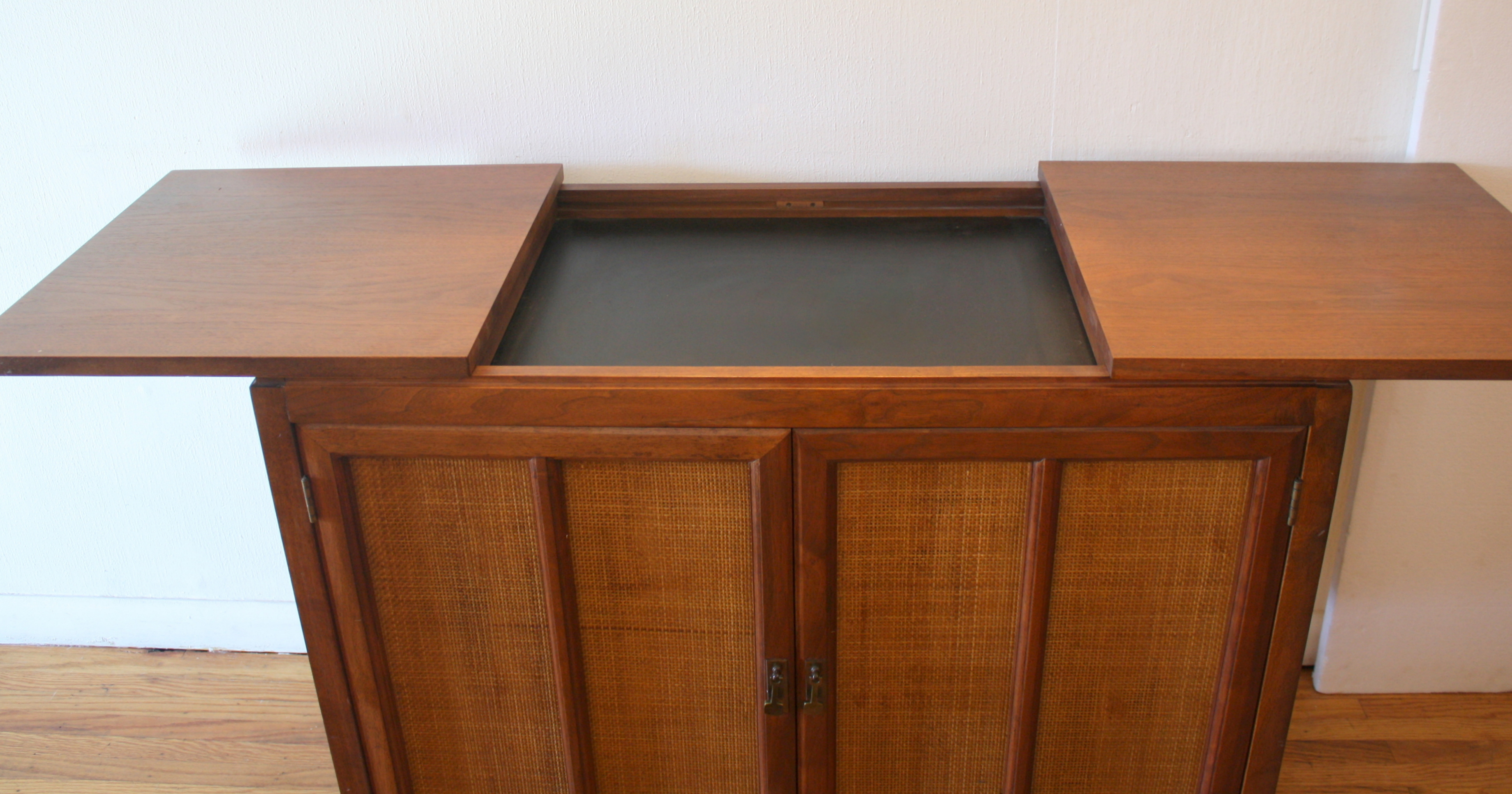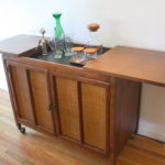 This is a mid century modern rolling bar serving cart with a hidden center section.  The 2 leaves slide open to reveal the center, and give extra serving space.  The bottom cabinet has 2 rattan doors with brass pulls, 2 adjustable shelves, and a serving drawer.  Dimensions: leaves closed: 36.5″W x 18″D x 29.5″H, leaves extended: 57.5″W, center area only: 20.5″W, 16″D, each individual leaf: 18″W.