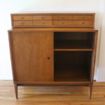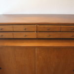 This is a beautiful cabinet designed by Paul McCobb for the Planner Group. It has a bottom sliding door cabinet, paired with a top modular drawer unit. The cabinet has an adjustable shelf, the top unit has 4 dovetailed drawers with brass knobs. This piece is maker’s marked on the back and in the drawer. Dimensions: Top drawer unit: 36″W x 12″D x 6″H. Bottom drawer unit: 36″W x 18″D x 33.5″H. Overall total height of pieces combined: 39.5″H.