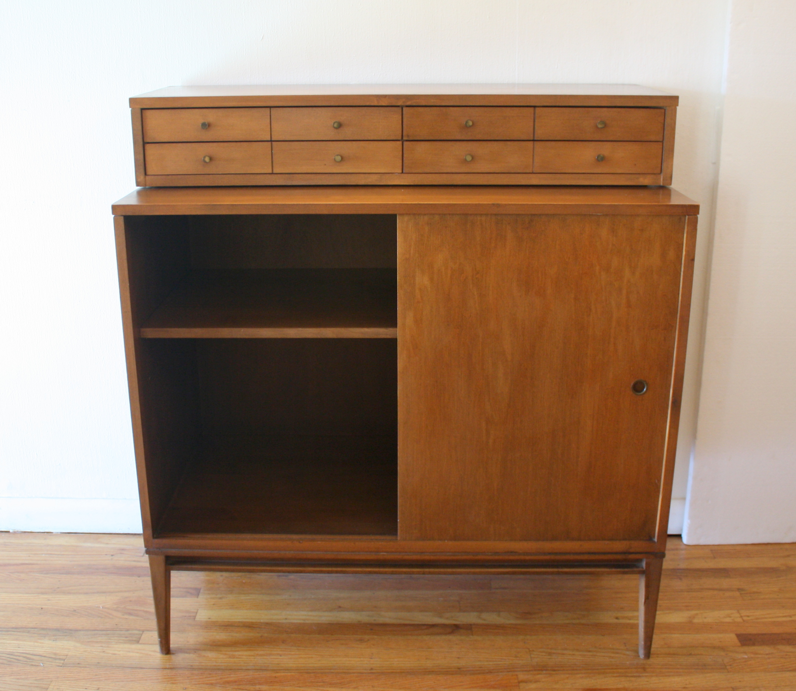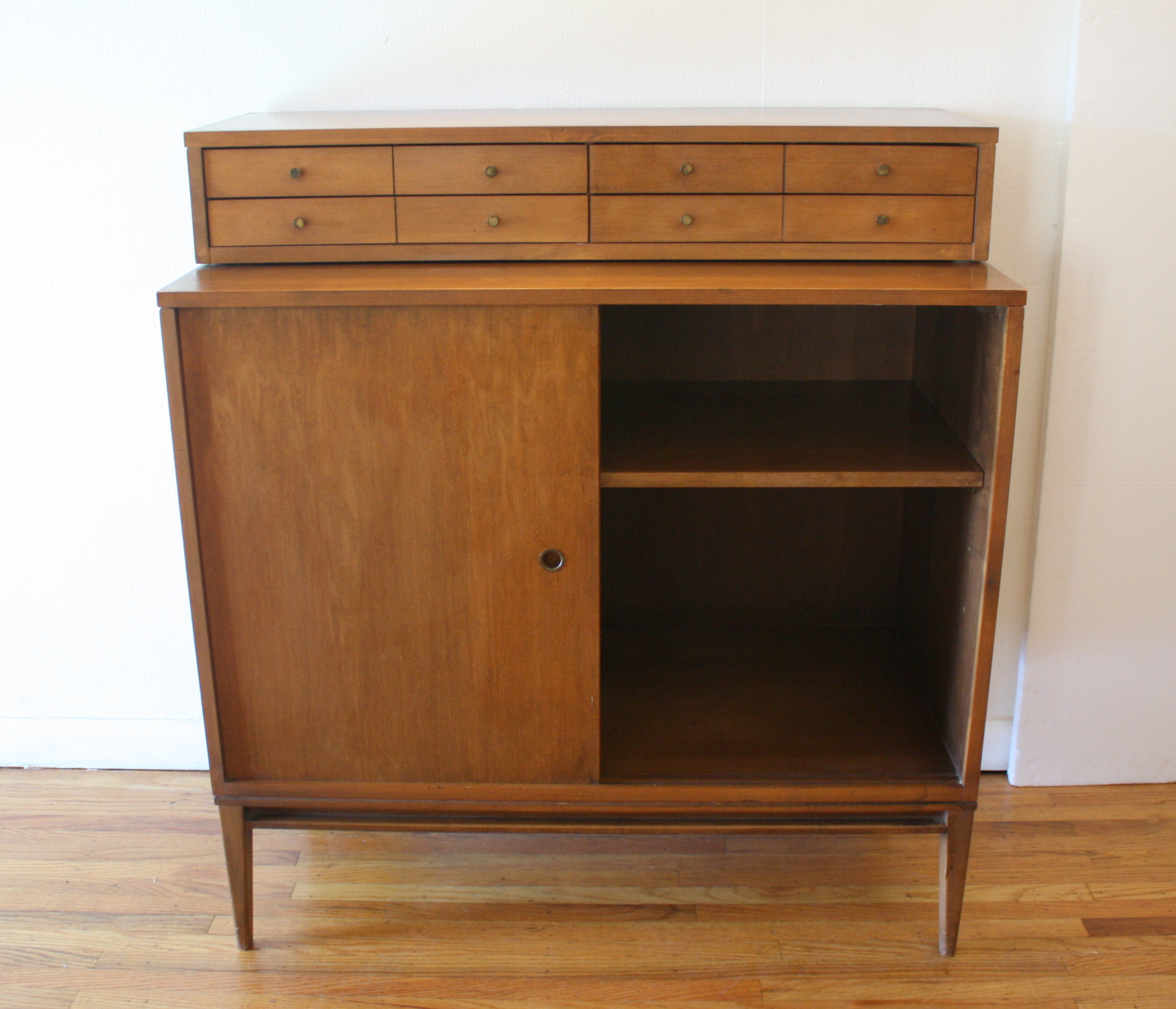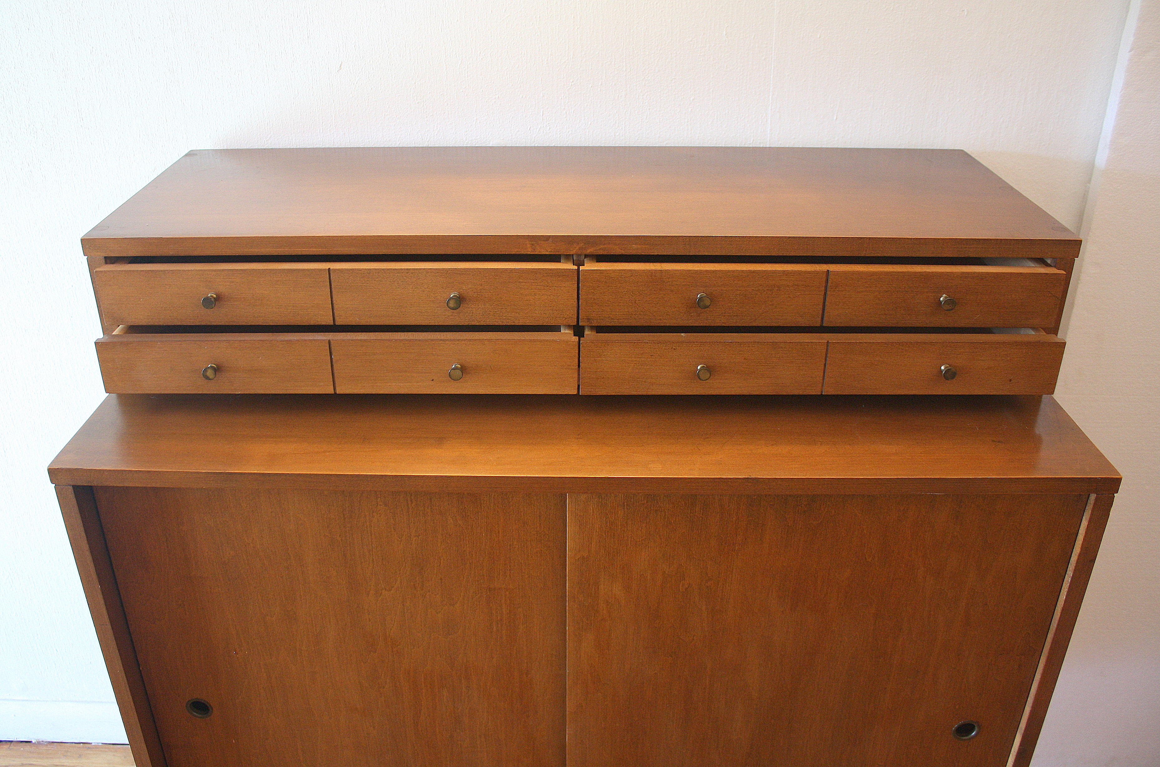 This is a beautiful cabinet designed by Paul McCobb for the Planner Group. It has a bottom sliding door cabinet, paired with a top modular drawer unit. The cabinet has an adjustable shelf, the top unit has 4 dovetailed drawers with brass knobs. This piece is maker’s marked on the back and in the drawer. Dimensions: Top drawer unit: 36″W x 12″D x 6″H. Bottom drawer unit: 36″W x 18″D x 33.5″H. Overall total height of pieces combined: 39.5″H.