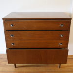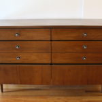 This is mid century modern low dresser credenza and matching bachelor chest dresser by Bassett. Each piece has modern inset metal pulls and a streamlined drawer design. Dimensions of low dresser: 52″W x 18″D x 30.5″H. Dimensions of bachelor dresser: 32″W x 18″D x 30″H.