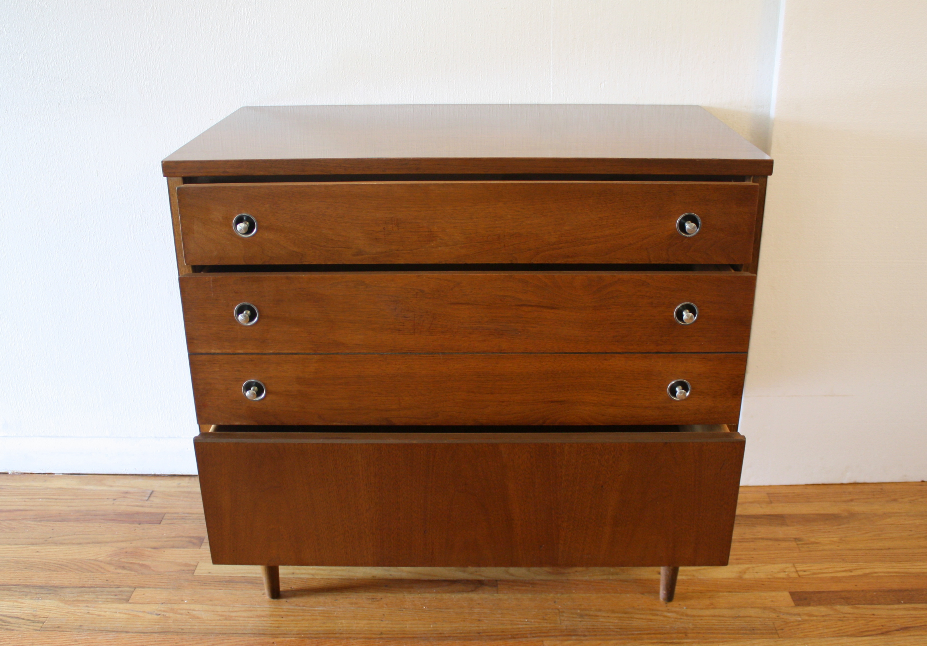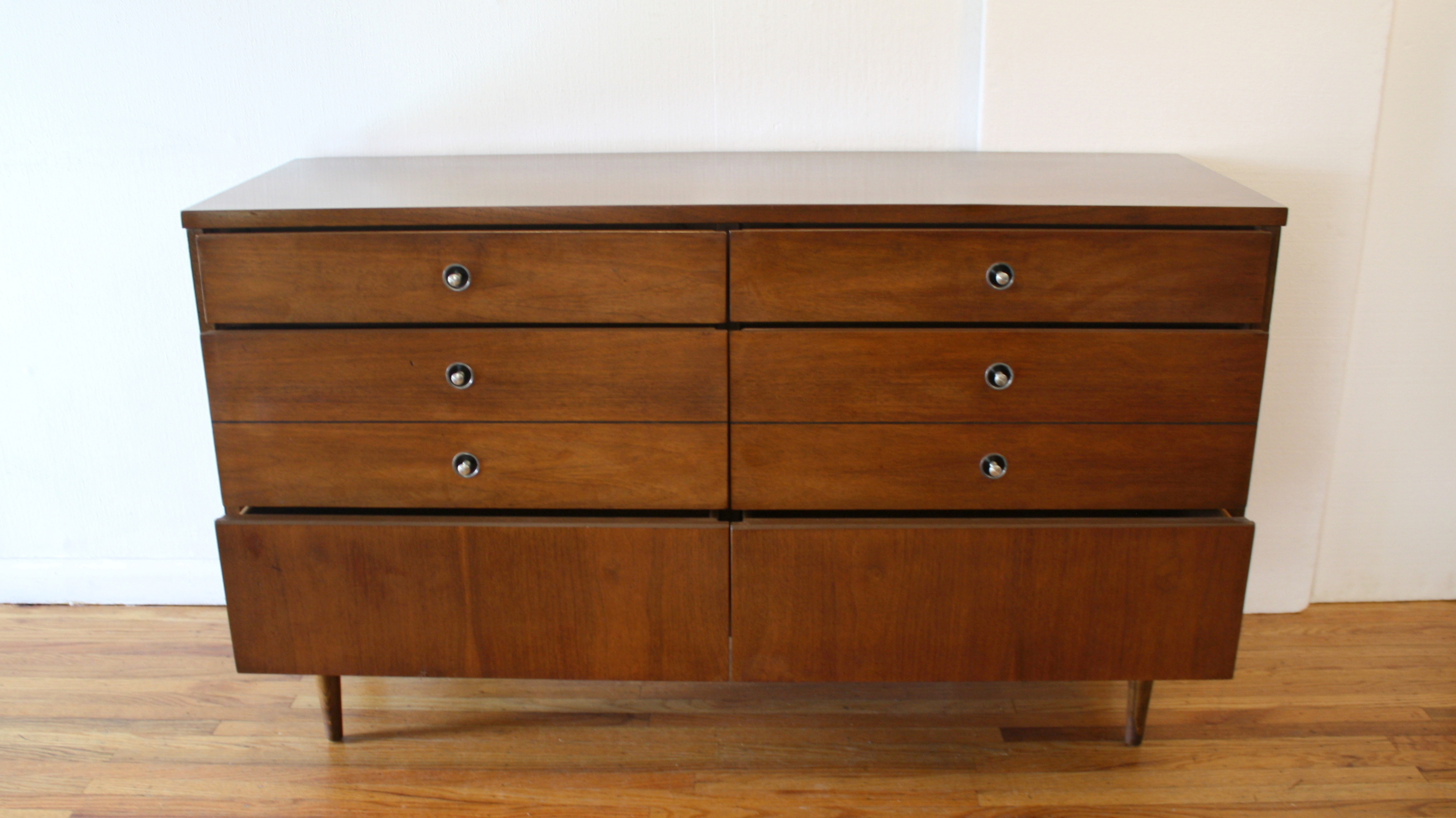 This is mid century modern low dresser credenza and matching bachelor chest dresser by Bassett. Each piece has modern inset metal pulls and a streamlined drawer design. Dimensions of low dresser: 52″W x 18″D x 30.5″H. Dimensions of bachelor dresser: 32″W x 18″D x 30″H.