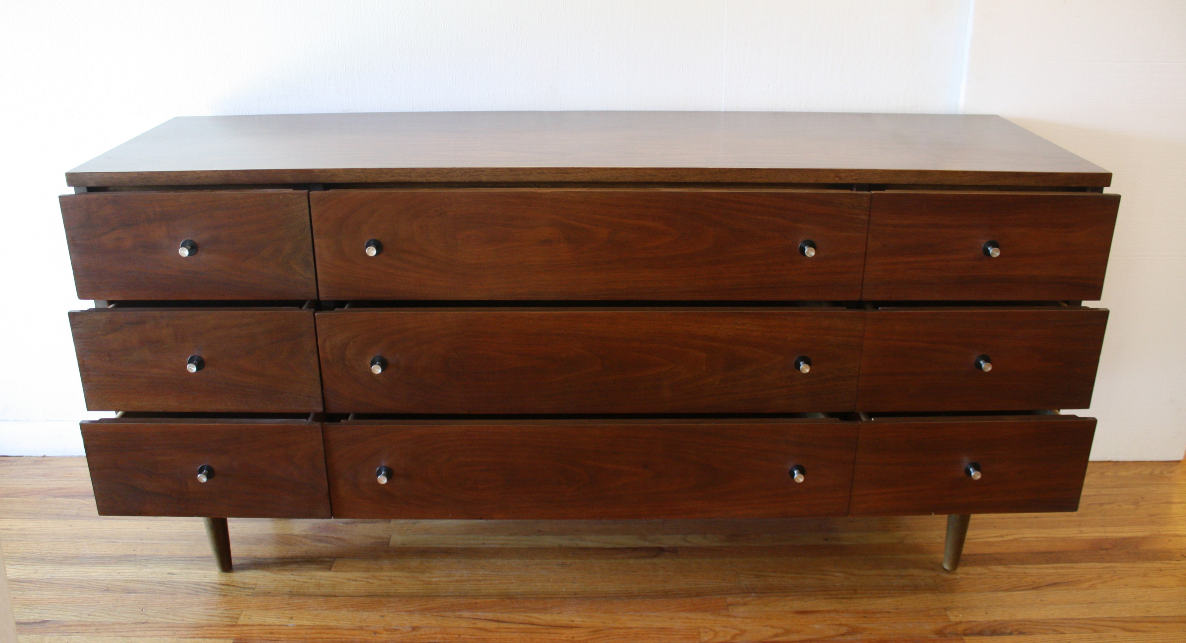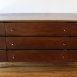 This is a mid century modern low dresser credenza by Stanley. It has 9 dovetailed drawers with their signature silver accented knobsĀ and tapered legs. Dimensions: 62″W x 18″D x 30″H.