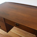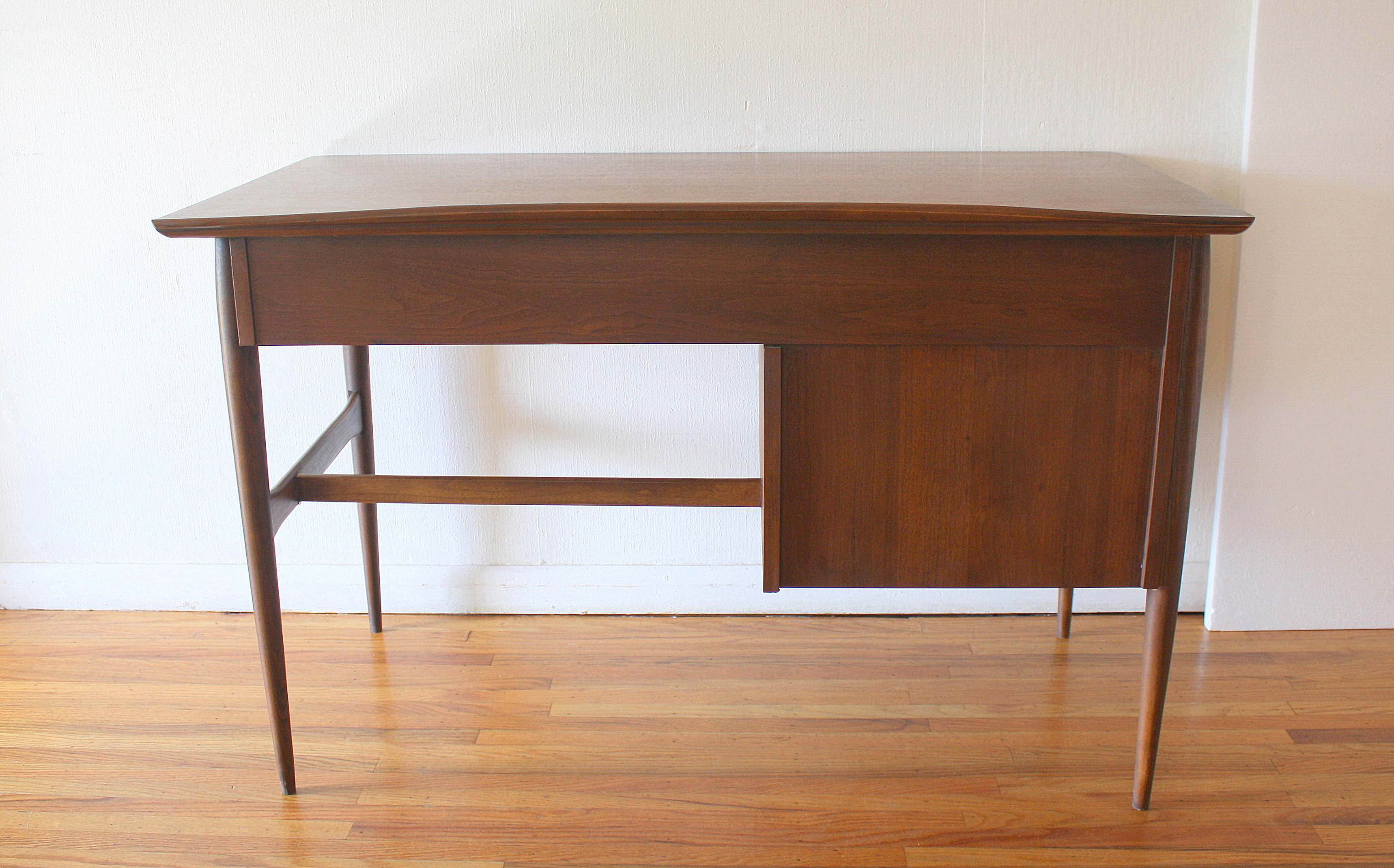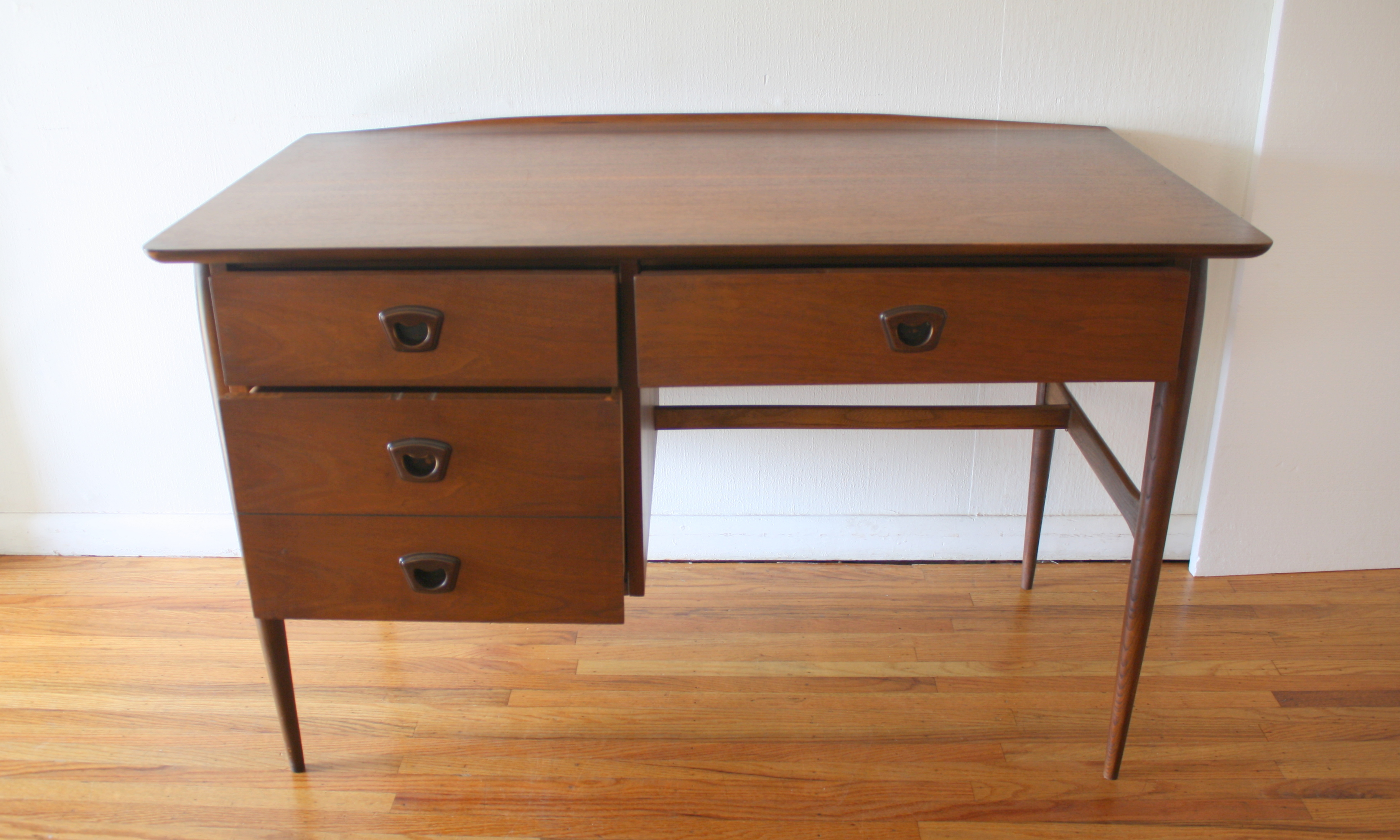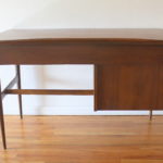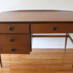 This is a mid century modern desk by Bassett. It has their signature surfboard edge, and 3 dovetailed drawers with carved handles, and tapered legs. The bottom left hand drawer is a file drawer. It has a finished back, so it can be front facing . Dimensions: 48″W x 25.5″D x 30″H.
