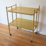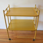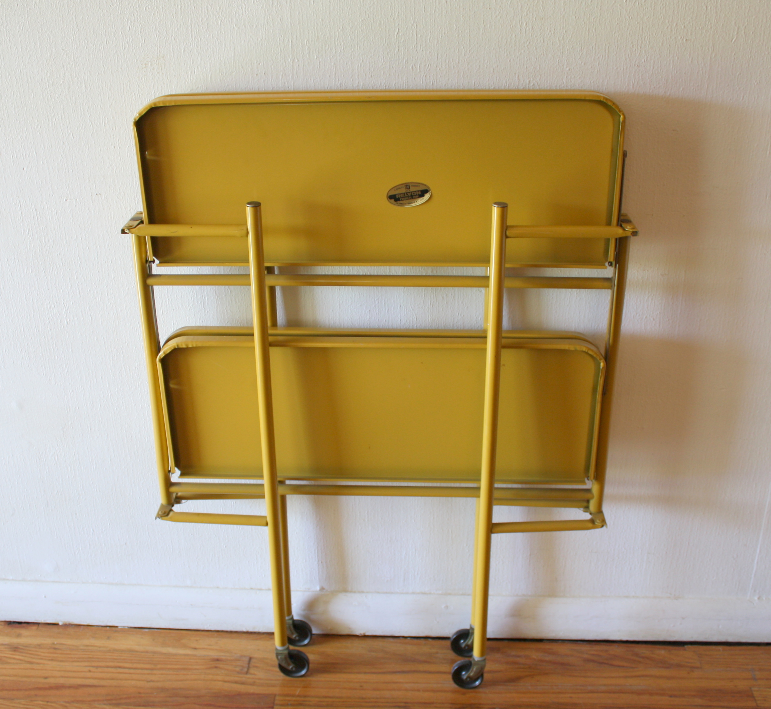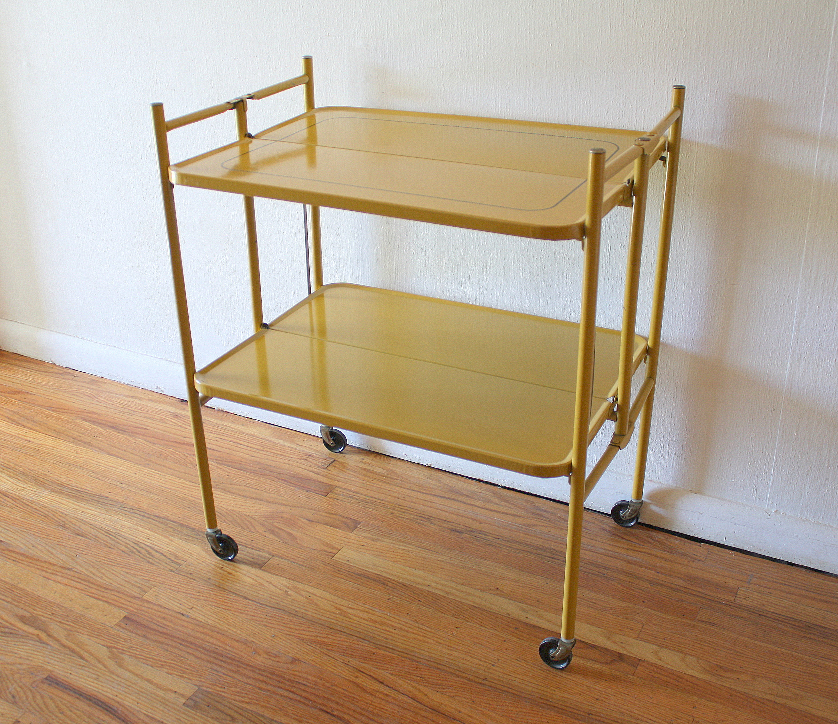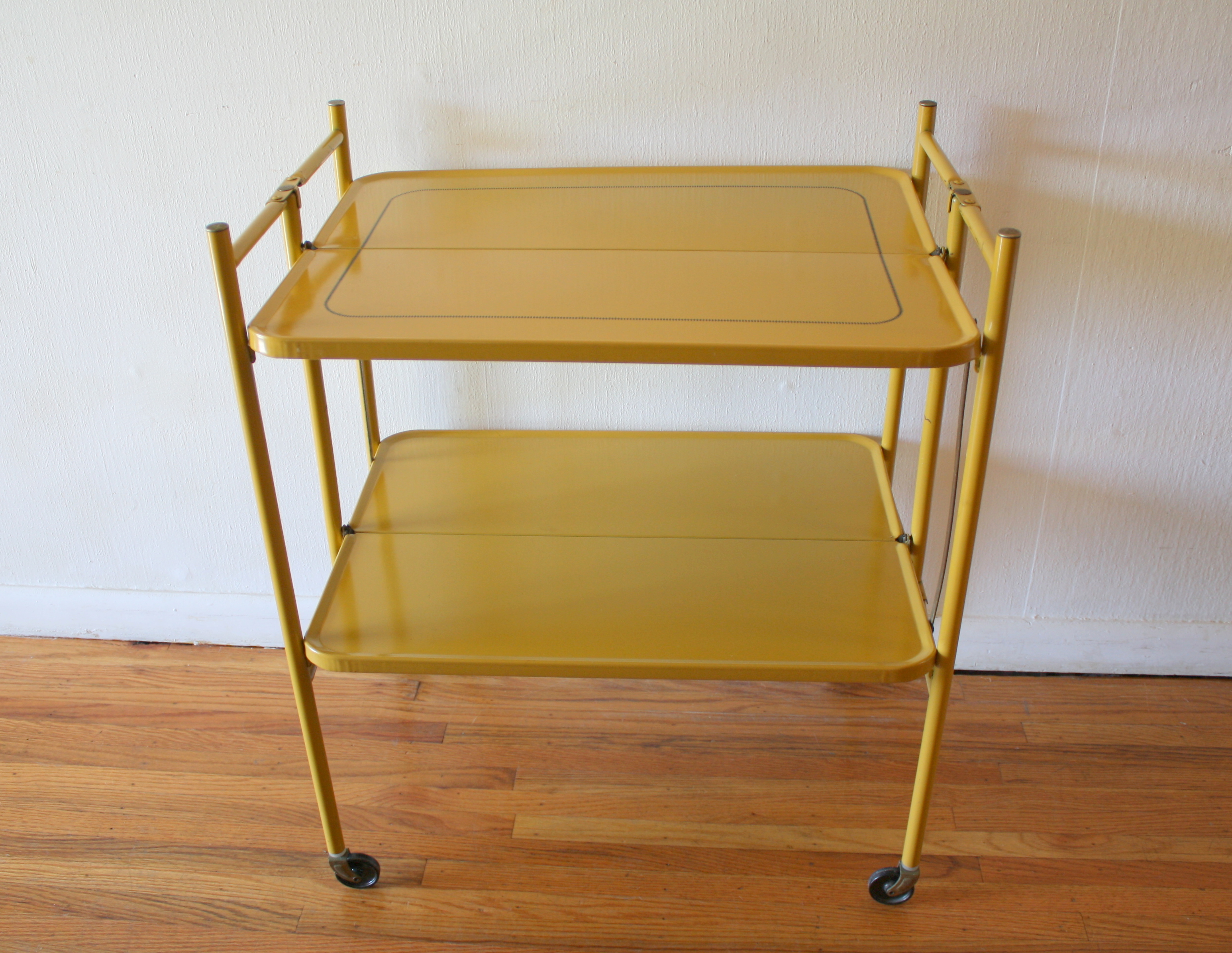 This is a mid century modern 2 tiered rolling metal bar serving cart in a cheerful sunflower.  It can be folded into a compact size for storage.  Dimensions: 25″W x 18″D x 31″H.