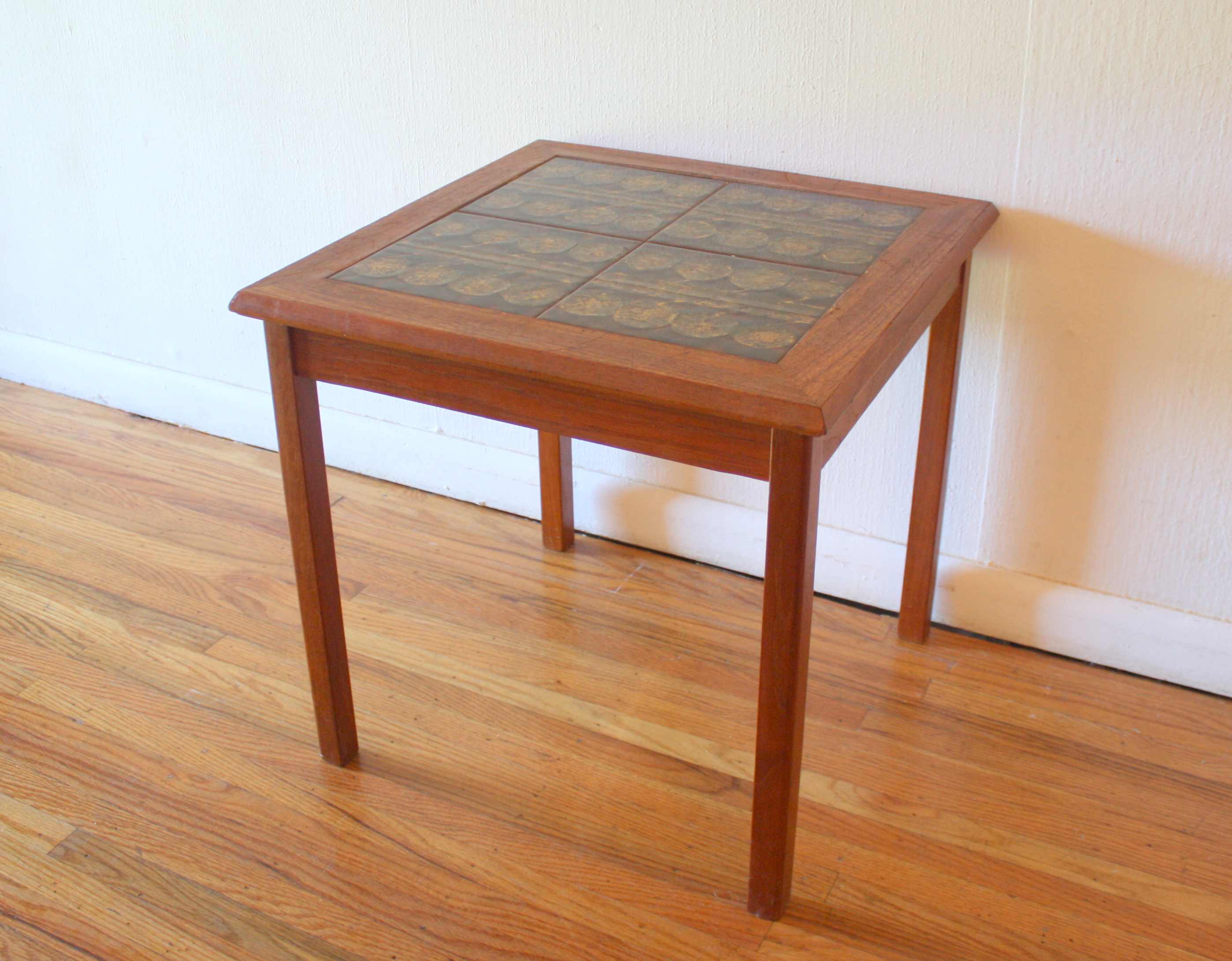 This is a mid century modern Danish teak tile top table with an abstract gold circle design.  Dimensions: 20.5″Wx 20.5″D x 20″H.