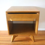 This is a mid century modern side end table designed by Jack Van der Molen for Jamestown Lounge Furniture Company. It has 1 dovetailed drawer with a curved handle, bottom shelf, and splayed arched legs: 20″ W x 18″ D x 24.5″ H.