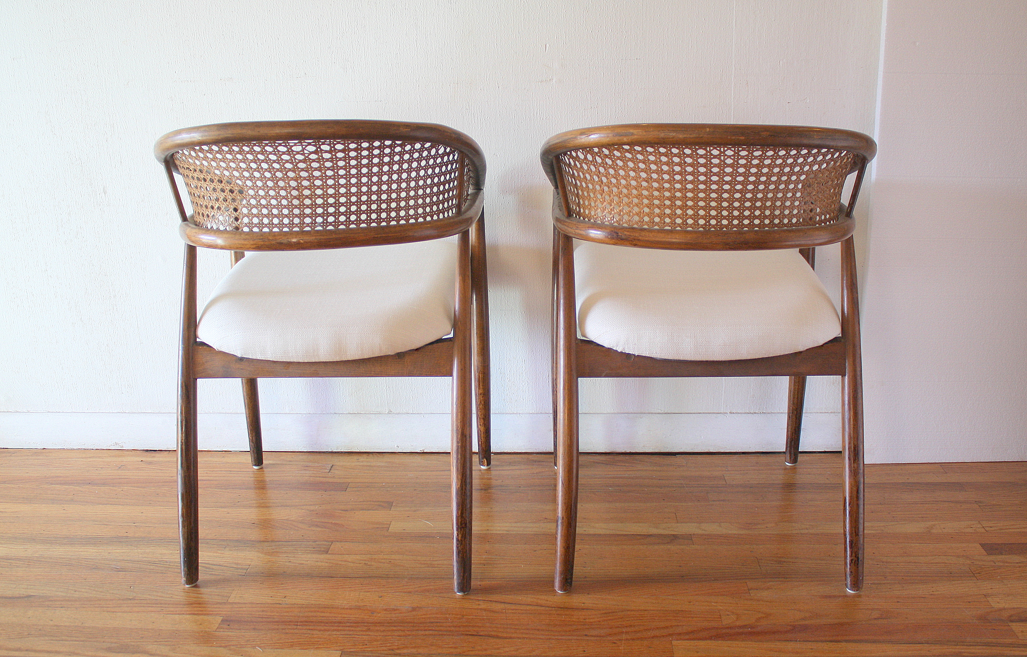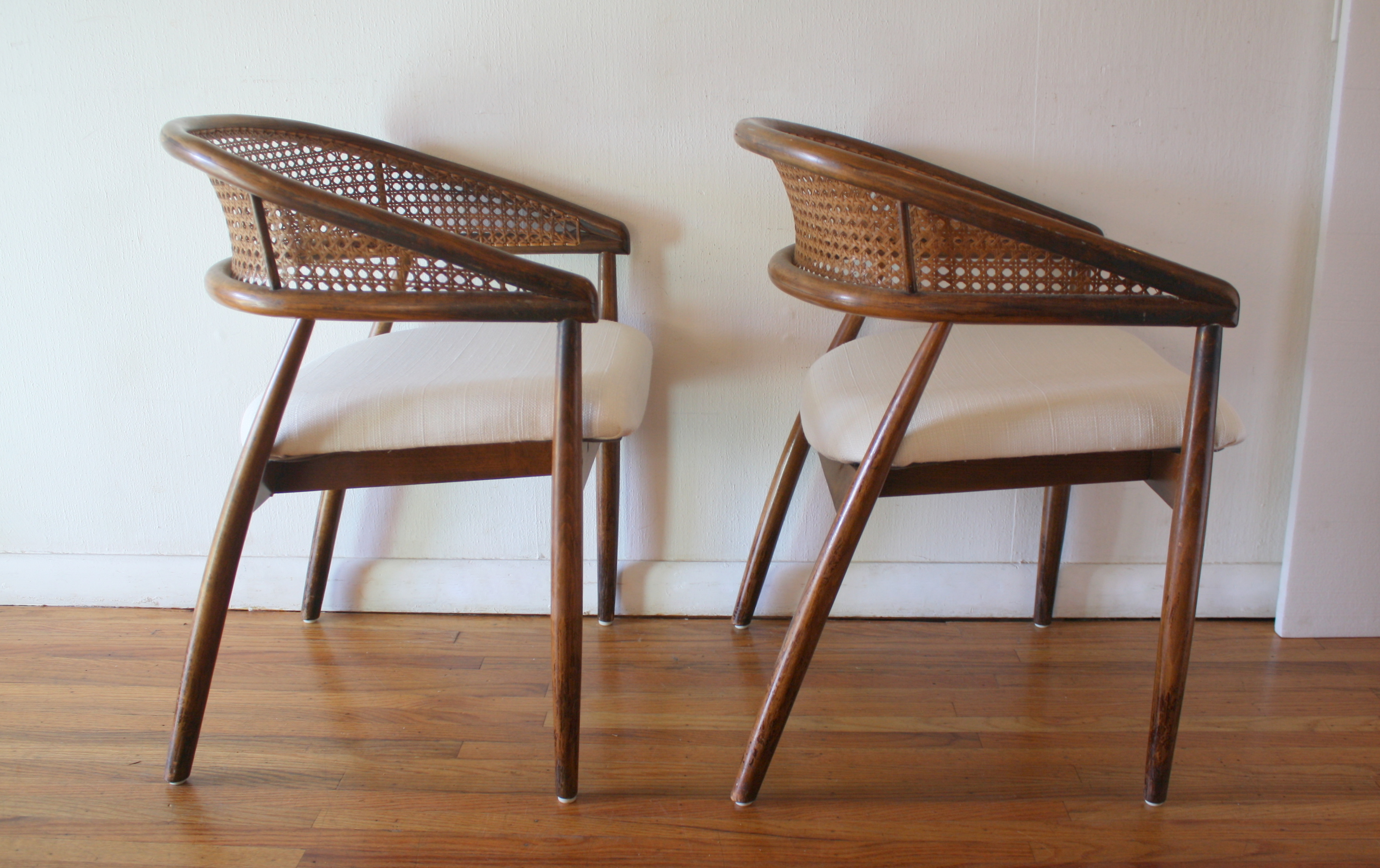 This is a pair of mid century modern chairs with beautiful solid wood frames with curved caned rattan backs and tapered legs. The seats have been newly upholstered with pretty cream tweed. Dimensions: 17″ seat width, 18″ seat depth, 18.5″ seat height, 29.5″ back height.