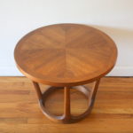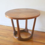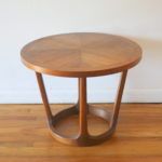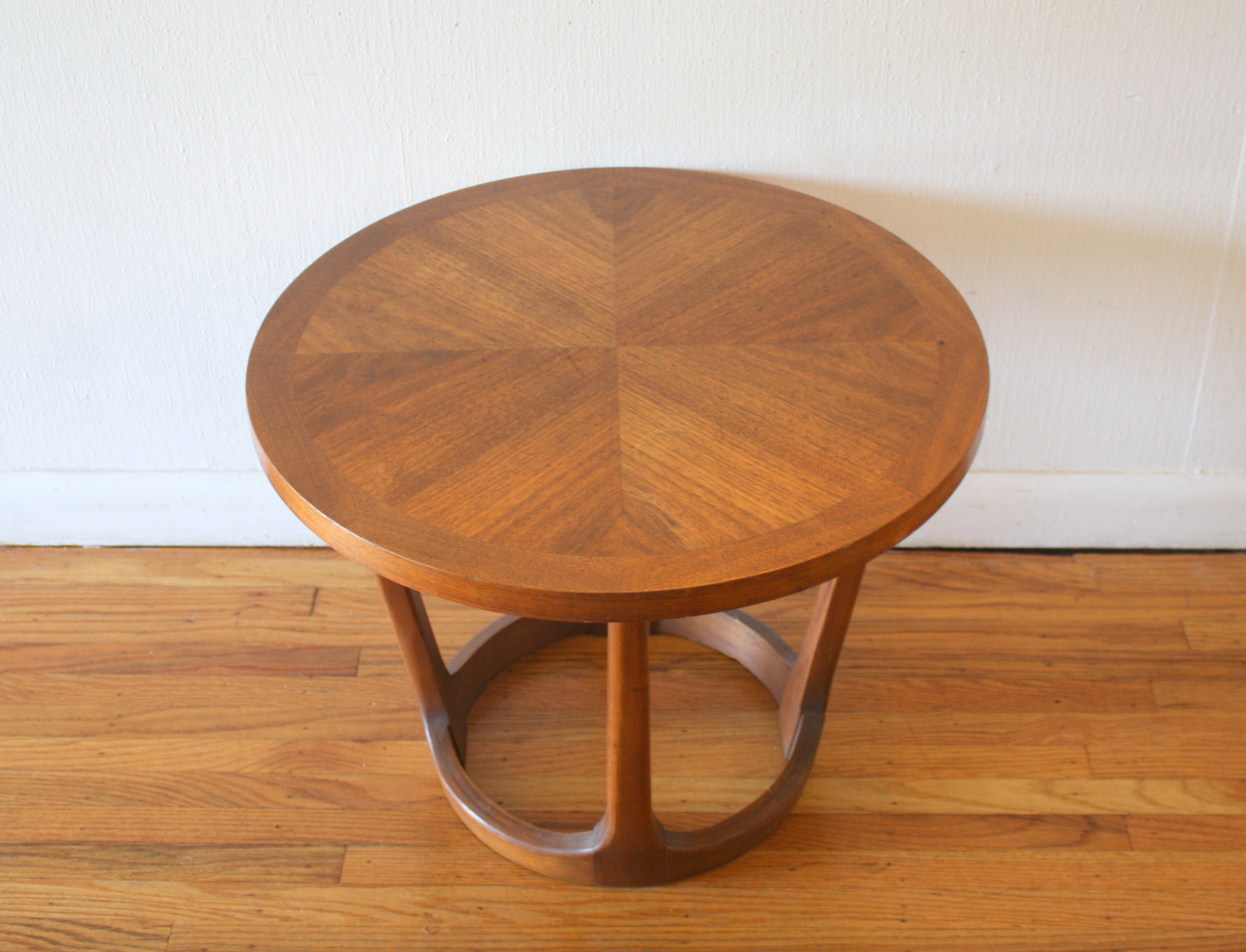 Mid Century Modern Sculpted Base Side End Table by Lane This is a mid century modern round side end table by Lane. It has a sculpted base and parquet design top: 21″diameter, 16″H. Brutalist metal sailboat sculpture is sold separately. *SOLD*