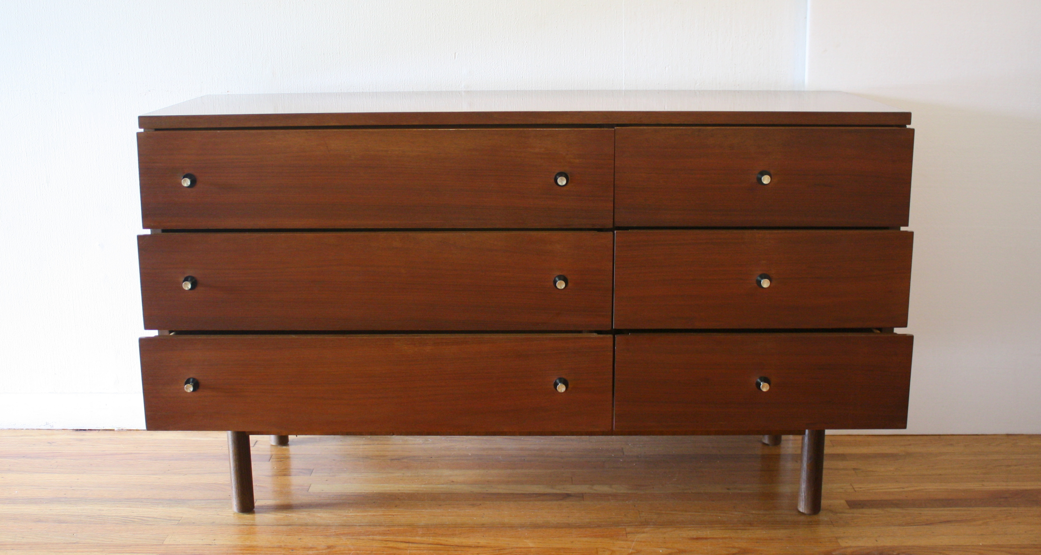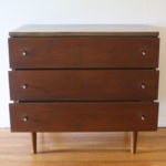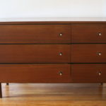 These are 2 mid century modern dressers by Stanley.  Both dressers have their signature silver accented dovetailed drawers.  The low dresser credenza has 6 dovetailed drawers: 52″W x 18″D x 30″H. The bachelor dresser has 3 dovetailed drawers: 32″W x 18″D x 30″H.