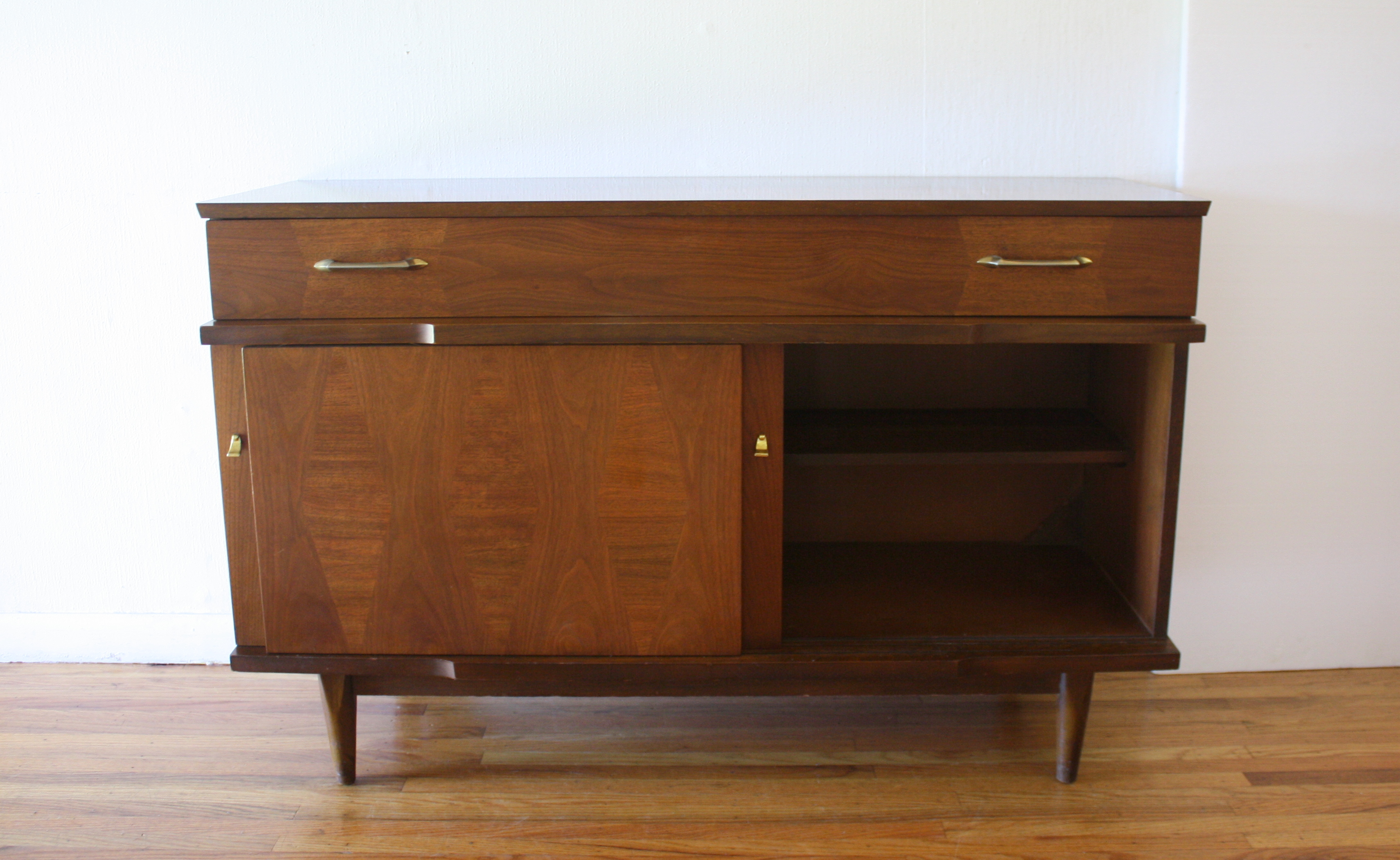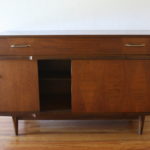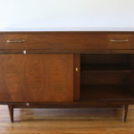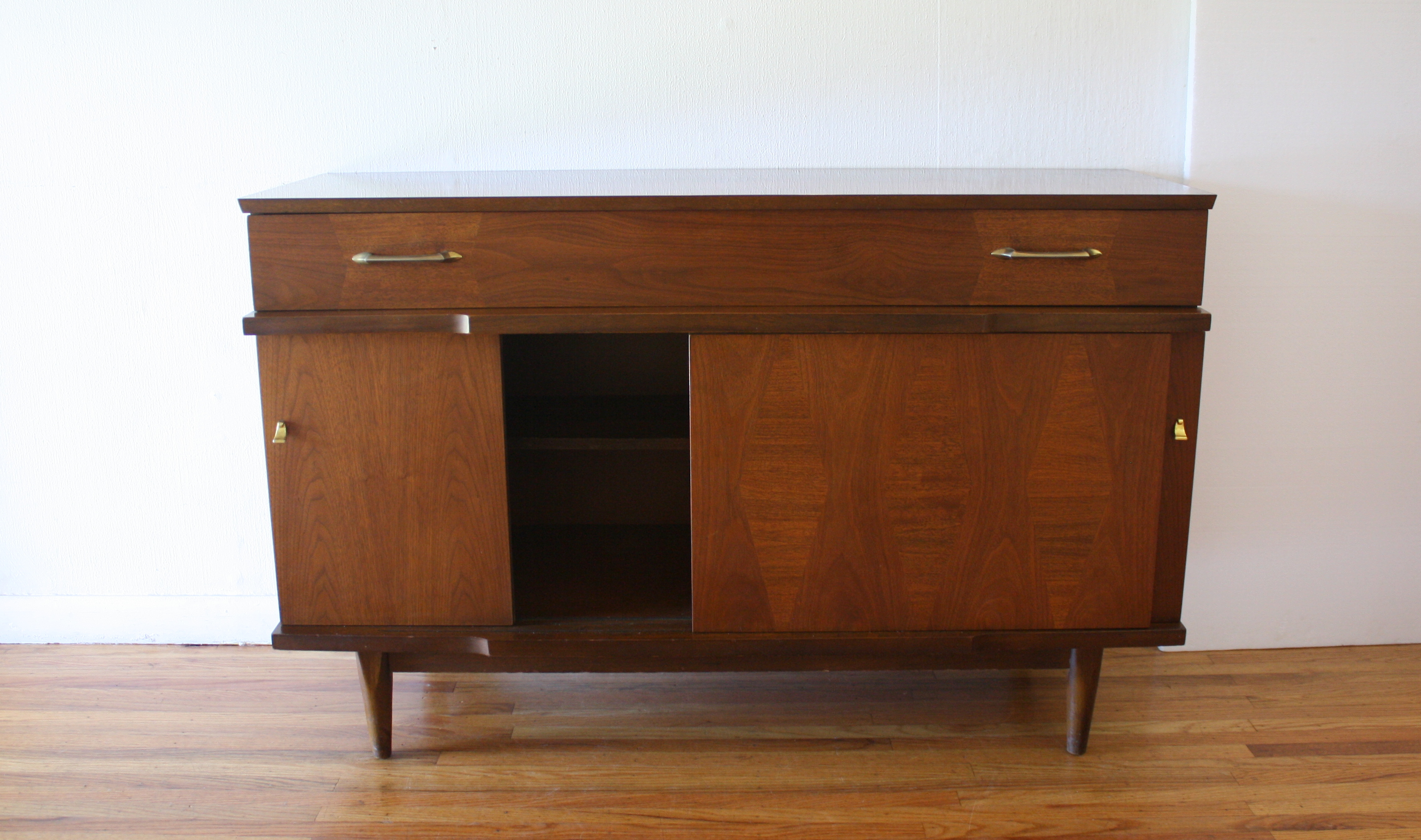 This is a mid century modern credenza with a sculpted accents, a bottom cabinet with 3 sliding doors with a diamond parquet design and shelving inside, 1 dovetailed drawer with brass pulls, and tapered legs. Dimensions: 48.5″W x 16″D x 30.5″H.