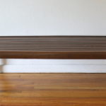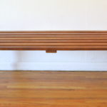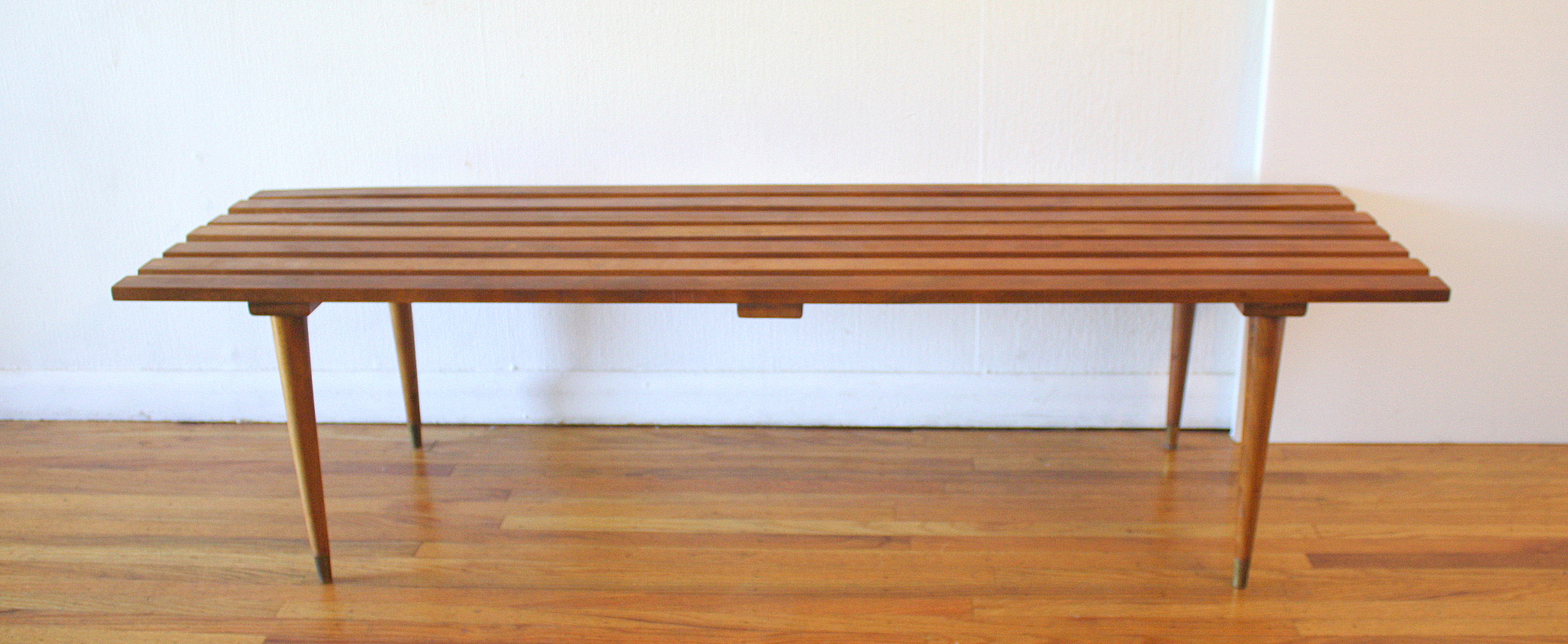These are 2 mid century modern slatted coffee table benches.  The first has a rounded edge, angled design, and tapered legs: 60″W x 18.5″D x 15″H.  The second has a flat edge design in, and tapered legs: 60″W x 18″D x 15.5″H.