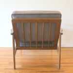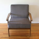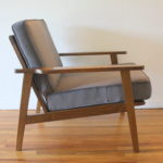 This is a mid century modern arm lounge chair with a solid wood frame, sculpted curved arms, tapered legs, and upholstered with new luxe elephant gray velvet cushions. Dimensions: seat width: 23″, seat depth: 21.5″, seat height: 17″, back height: 29″.