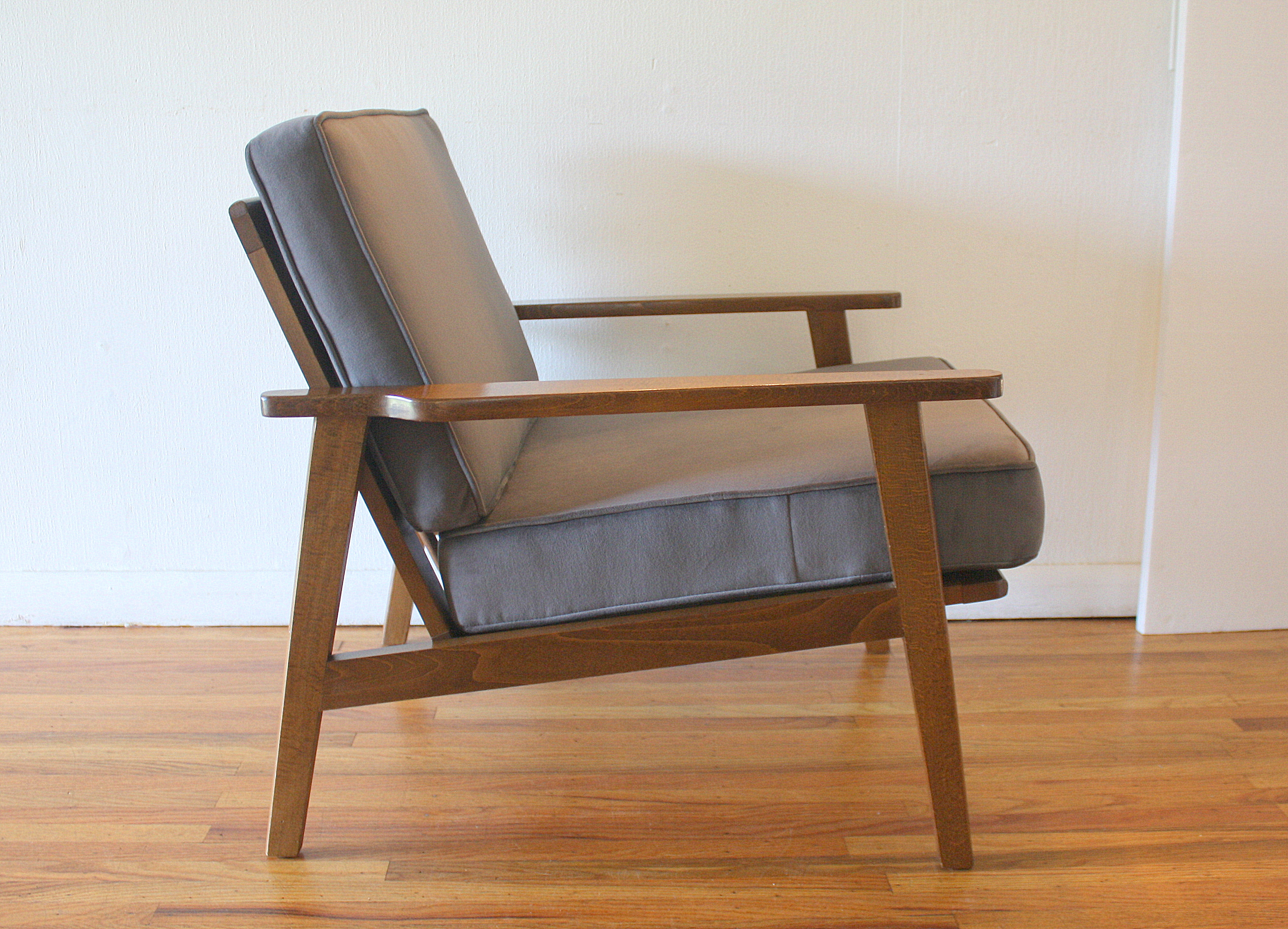 This is a mid century modern arm lounge chair with a solid wood frame, sculpted curved arms, tapered legs, and upholstered with new luxe elephant gray velvet cushions. Dimensions: seat width: 23″, seat depth: 21.5″, seat height: 17″, back height: 29″.