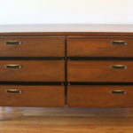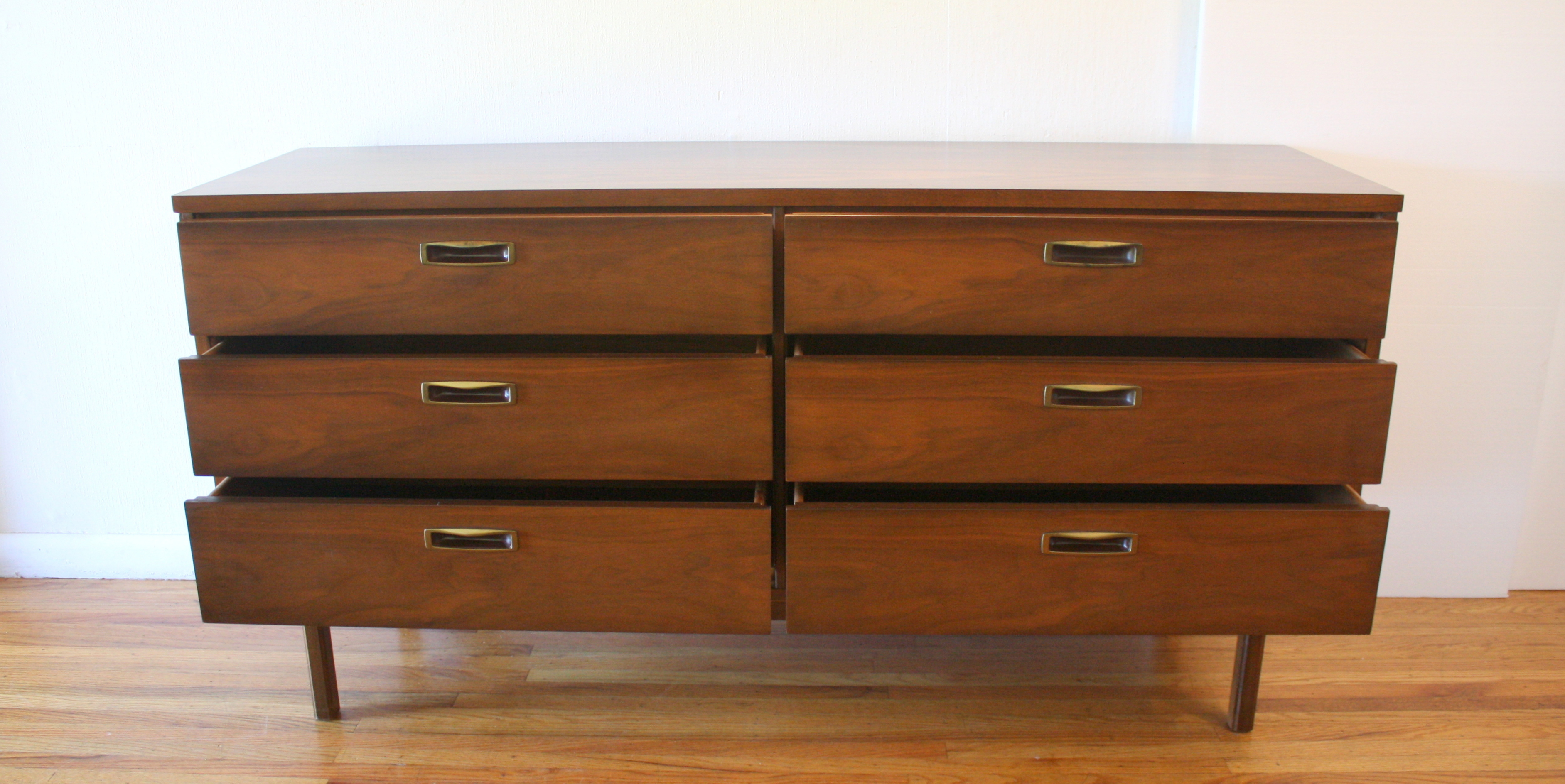 Mid Century Modern Low Dresser Credenza This is a mid century modern low dresser credenza with 6 dovetailed drawers with beautiful carved brass handles. Dimensions: 60″W x 18″D x 30″H. *SOLD*