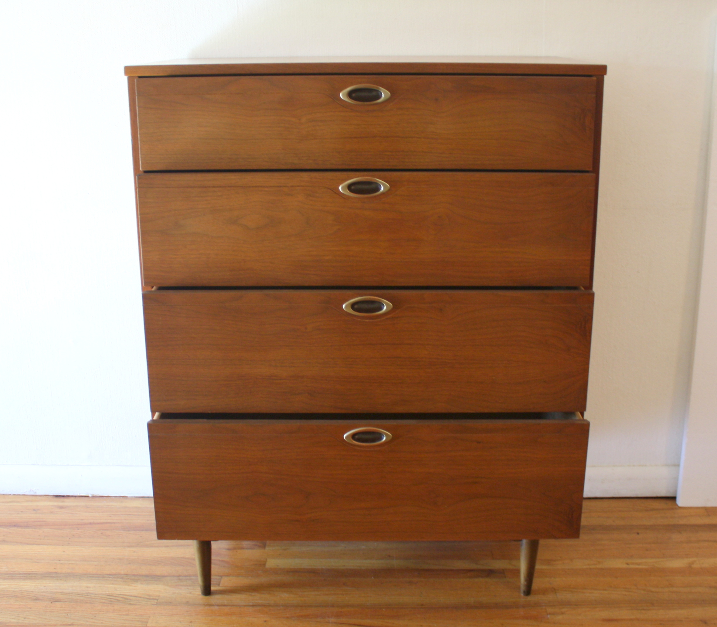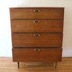 This is a mid century modern tall dresser from Hooker’s Mainline series. It has 4 dovetailed drawers with their signature carved brass handles, and tapered legs. Dimensions: 34″W x 19″D x 44″H.