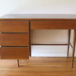 This is a matching set of mid century modern pieces with a streamlined drawer design, and tapered legs. The low dresser has 3 dovetailed drawers: 40″W x 17″D x 31″H. The desk has 4 dovetailed drawers: 44″W x 17″D x 31″H. The pair of nightstands has 1 dovetailed drawer, and a bottom shelf: 20″W x 15″D x 24″H.
