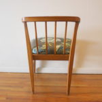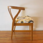 These are 2 mid century modern arm chairs with solid wood frames and newly upholstered seats in modern fabric. The first chair has a spindle back, and new modern fabric with slate gray, turquoise and chartreuse florals: seat width: 20″, seat depth: 17″, seat height: 20″, back height: 30.5″. The second chair has a wishbone back, and new modern fabric with an abstract gear pattern of black, white, and sunflower: SW: 20″, SD: 17″, SH: 18.5″, BH: 29″.