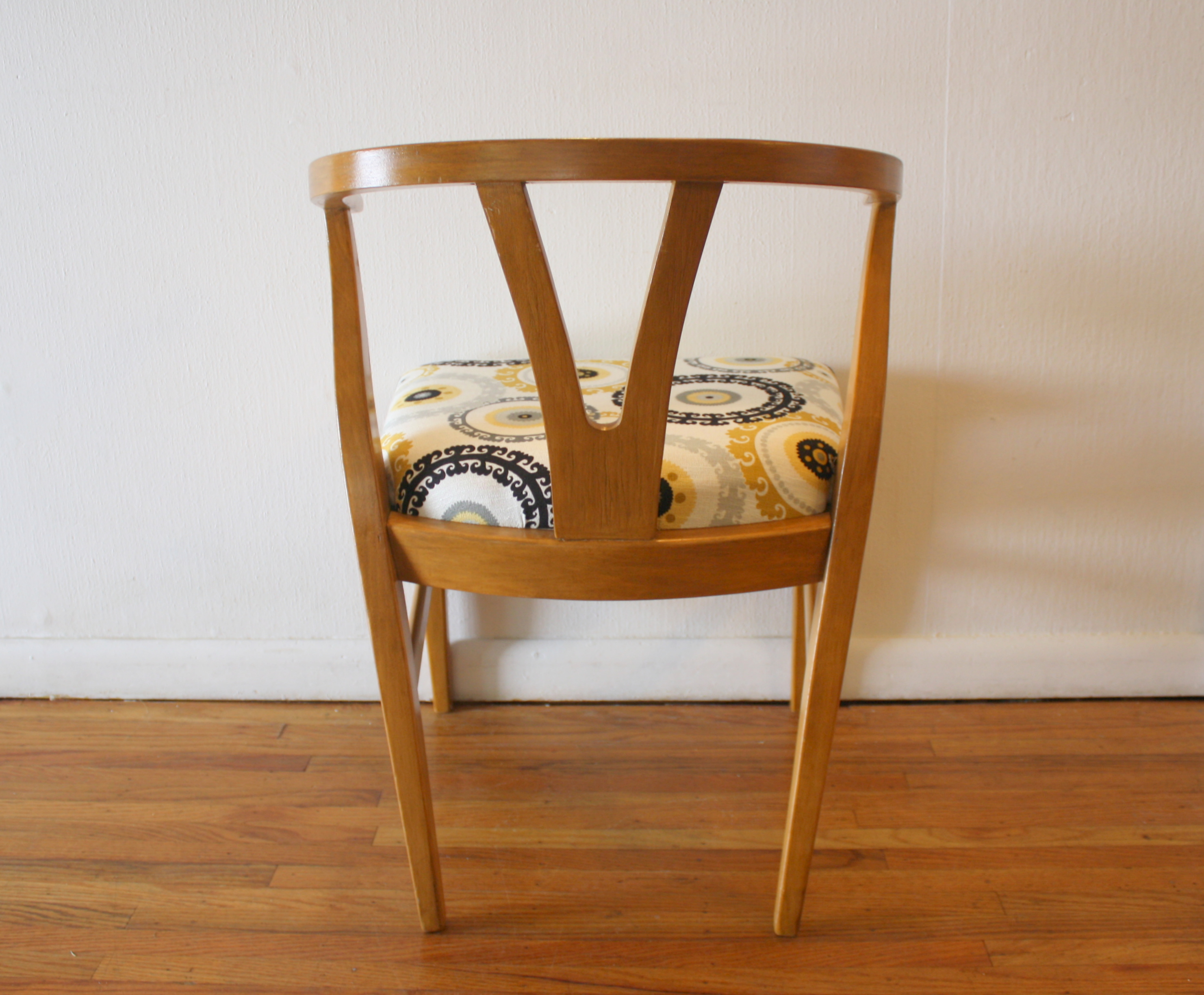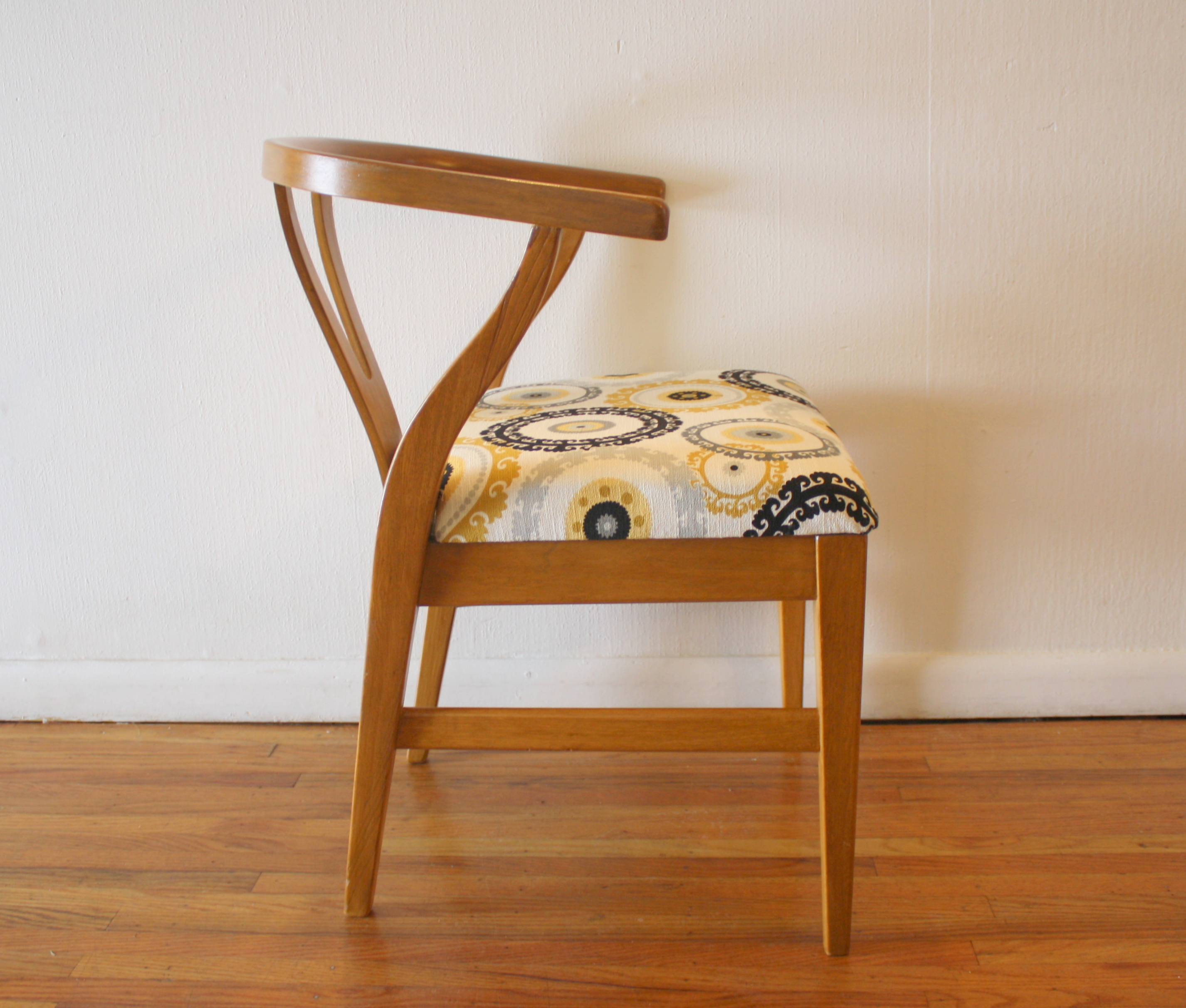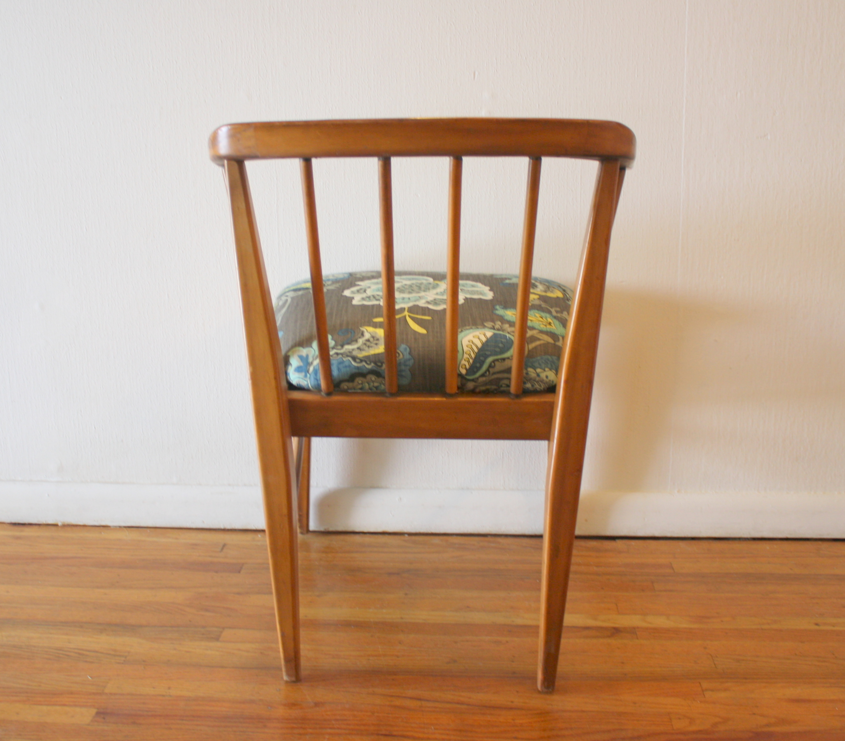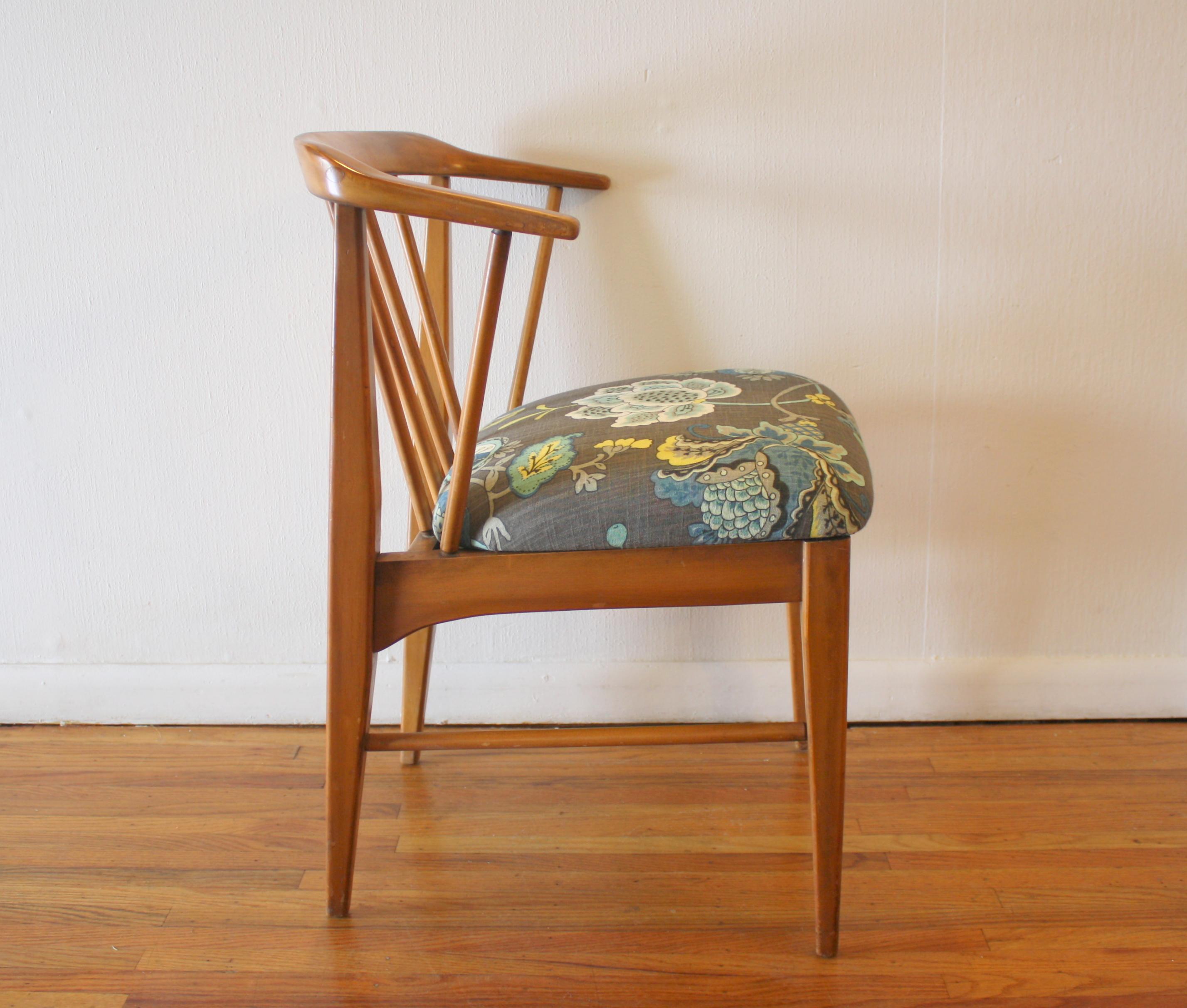 These are 2 mid century modern arm chairs with solid wood frames and newly upholstered seats in modern fabric. The first chair has a spindle back, and new modern fabric with slate gray, turquoise and chartreuse florals: seat width: 20″, seat depth: 17″, seat height: 20″, back height: 30.5″. The second chair has a wishbone back, and new modern fabric with an abstract gear pattern of black, white, and sunflower: SW: 20″, SD: 17″, SH: 18.5″, BH: 29″.