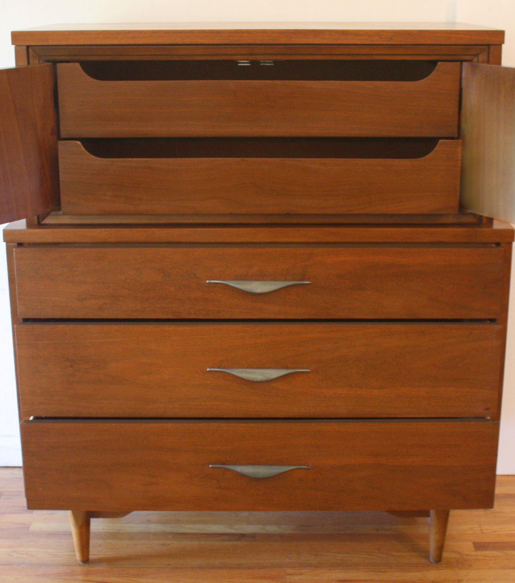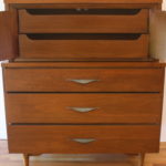 Mid Century Modern Tall Dresser Armoire This is a tall dresser armoire with 5 dovetailed drawers, 2 in the top cabinet and 3 bottom drawers with curved metal pulls, an arched base with tapered legs. Dimensions: 37.5″ W x 19″ D x 45.5″ H. *SOLD*