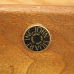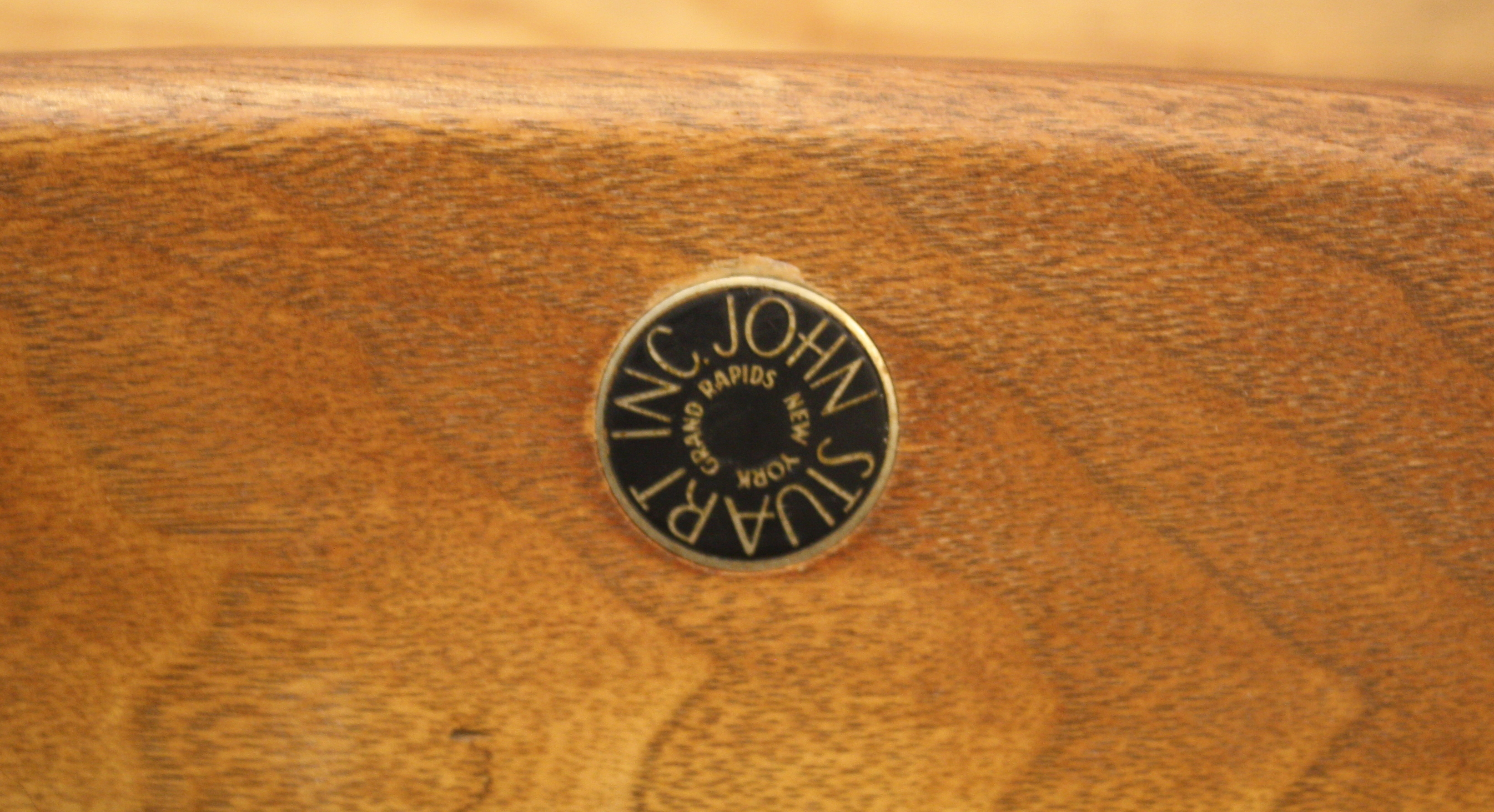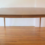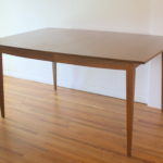 This is a set of mid century modern dining chairs by John Stuart. The 2 arm and 2 side chairs have beautiful solid wood frames, have been newly upholstered in a gray Knoll style tweed, and are maker’s marked underneath.  Dimensions: seat width: 21″, seat depth: 21″, seat height: 18″, back height: 32.5″.  The mid century modern dining table has a surfboard design and tapered legs: 60″W x 40″D  29.5″H.