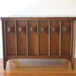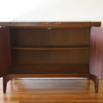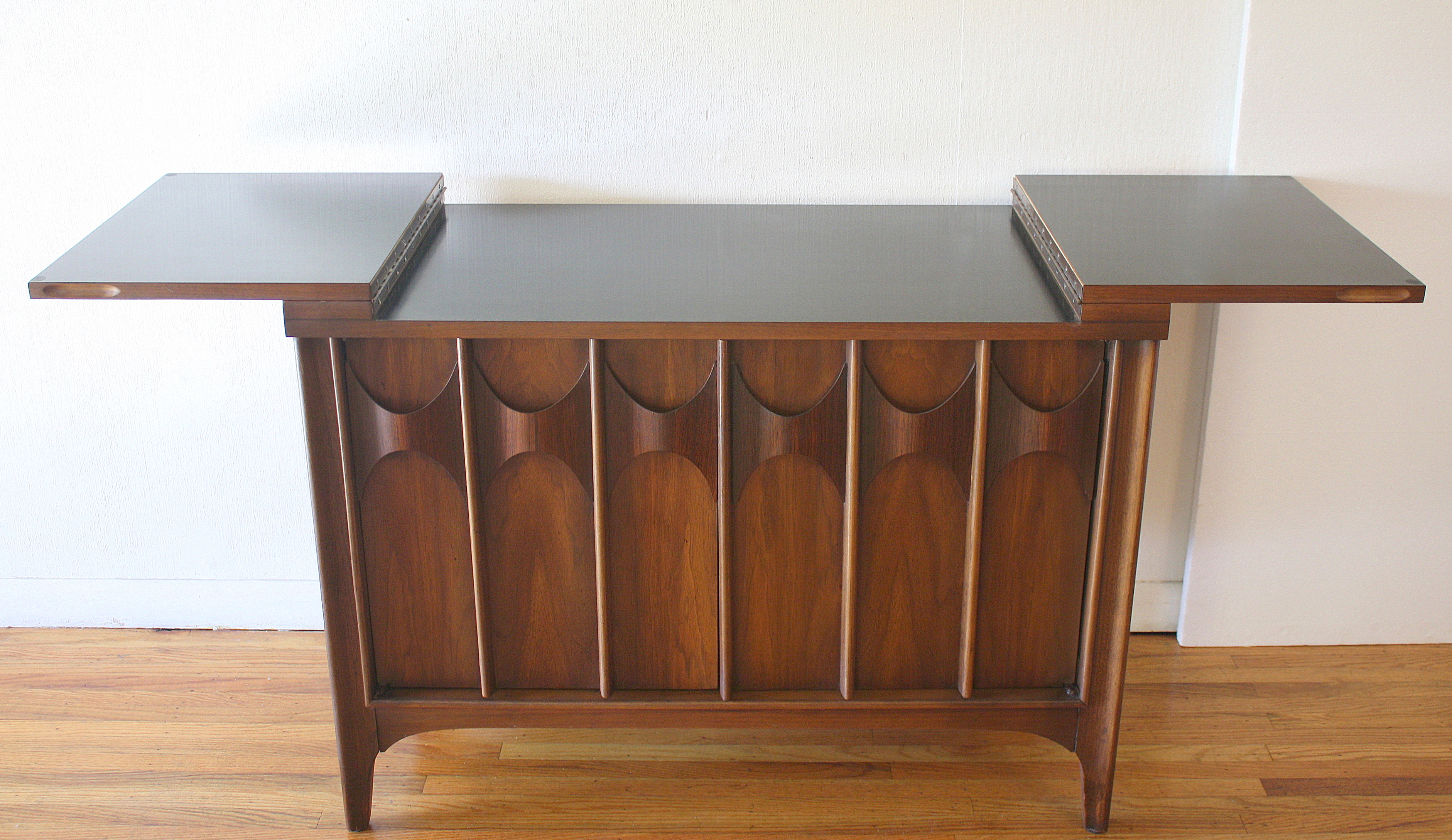 This is a mid century modern bar server credenza from the Kent Coffey Perspecta series. It has their signature arches and sculpted tapered legs. There is a hidden flip top of 2 extension leaves that open for extra serving space, and a bottom storage compartment with a shelf. The underside of the leaves have a sleek black formica for a protected serving area. Dimensions: 39”W x 18.5”D x 29”H, with leaves open: 62”W x 18.5″D x 30”H. Accessories sold separately.