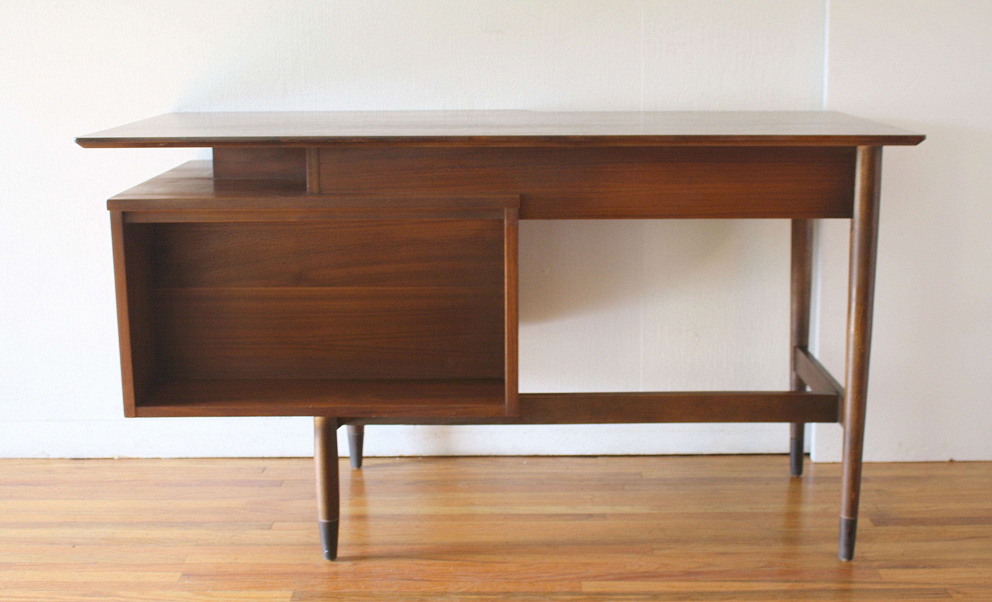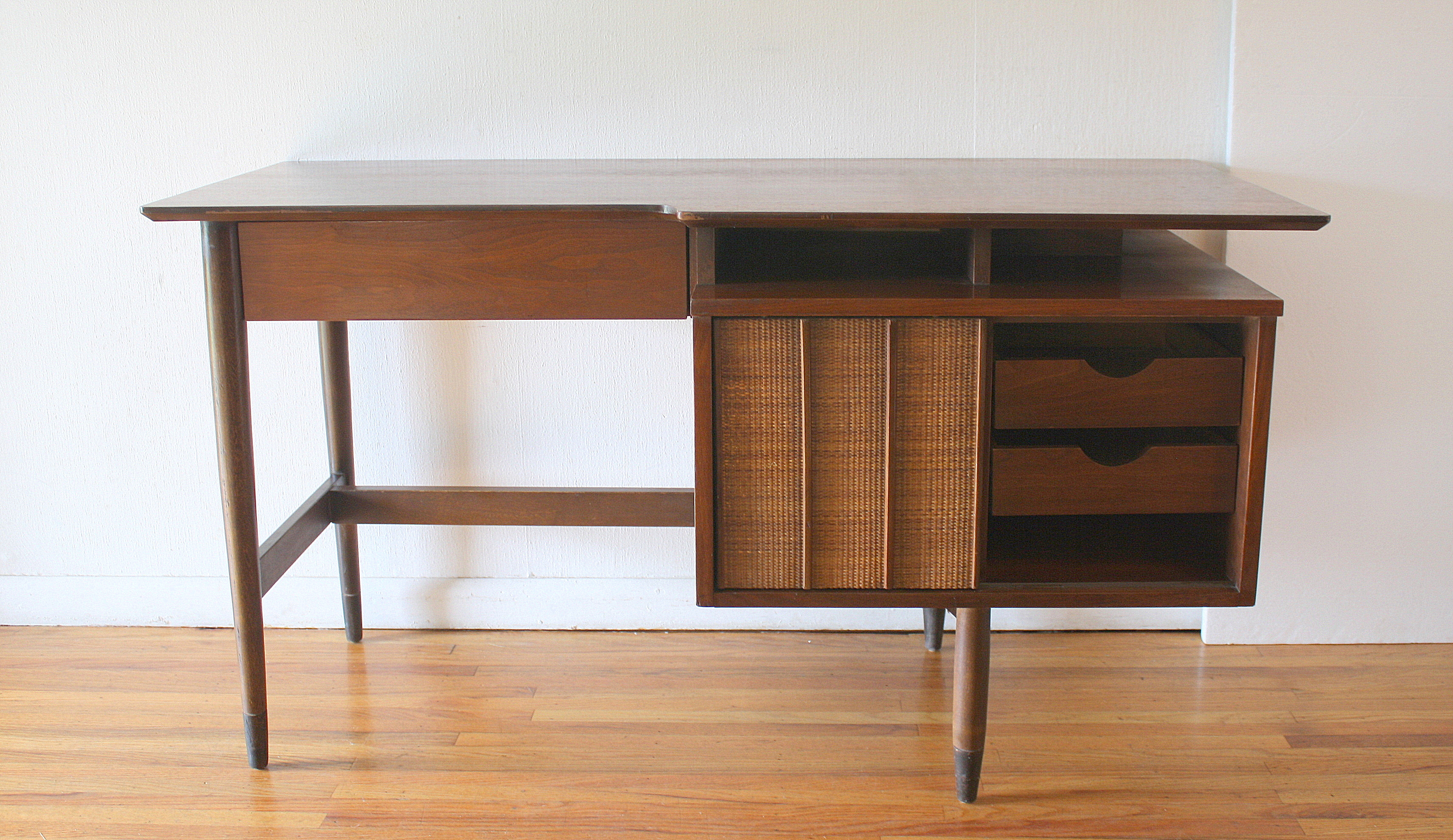 This is a mid century modern desk by Hooker Furniture. It has a cut out top with a floating design, and tapered legs. There is a shelf above the drawer unit. The drawer unit has 2 dovetailed drawers with metal pulls, and 2 dovetailed drawers behind a sliding rattan door. The desk has a finished back with a bookshelf, so it can be front facing. Dimensions: 54″W x 25″D x 29.5″H.