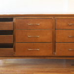 This is a low dresser credenza from the Kent Coffey Wharton series. It has 9 dovetailed drawers, 6 with beautiful angled brass handles, 3 are behind a side cabinet door, and angled tapered legs: 64″W x 20″D x 31.5″H.