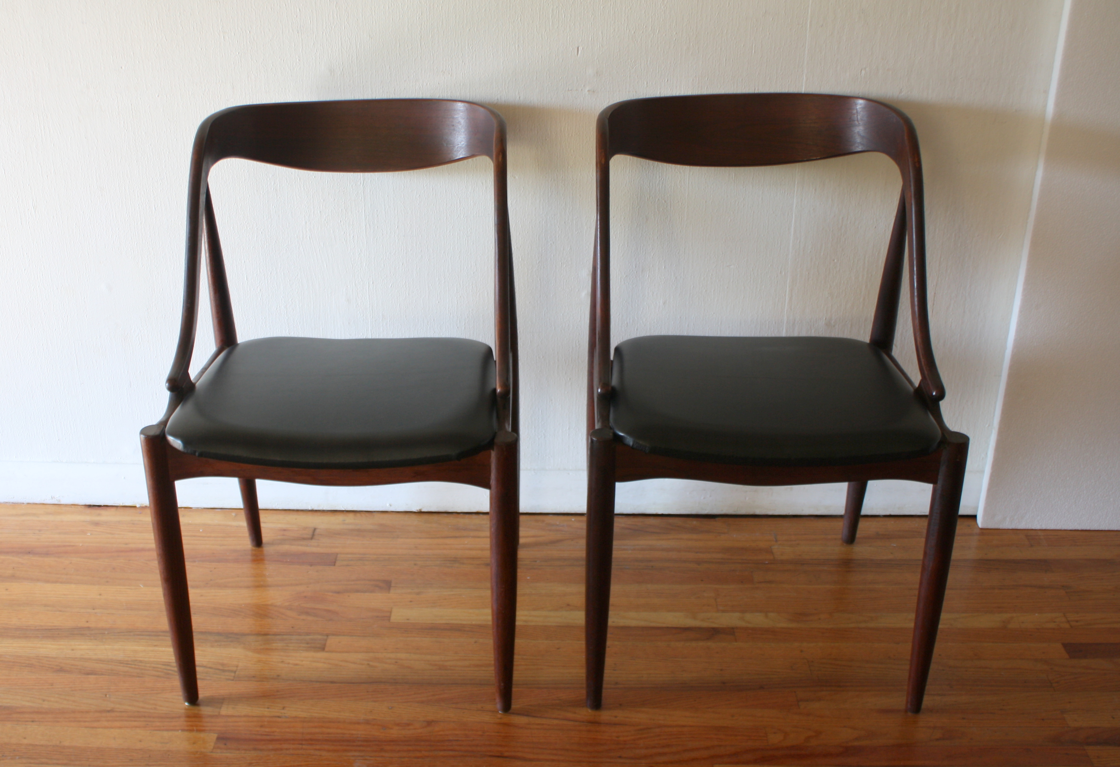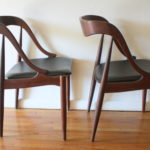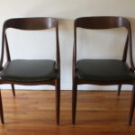 This is a pair of mid century modern Danish chairs by Johannes Andersen, with beautiful sculpted wood frames, reupholstered in sleek black naugahyde.  Dimensions: seat width: 17″, seat depth: 18″, seat height: 17.5″, back height: 30.5″.