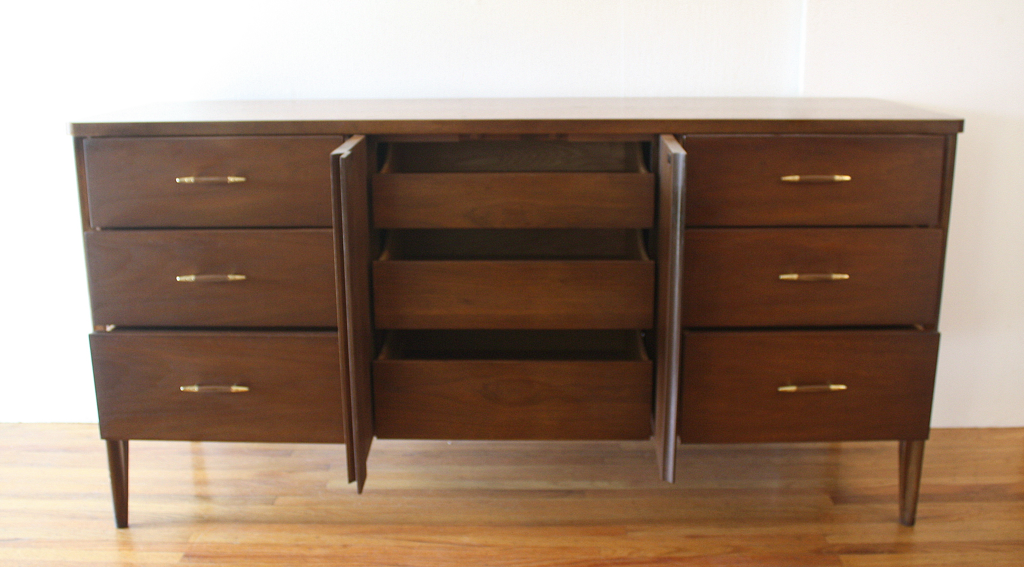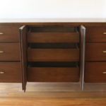 This is a mid century modern low dresser credenza from Broyhill’s Saga series. It has their signature carved starburst design, 9 dovetailed drawers, and sculpted tapered legs: 58″W x 18″D x 31″H.