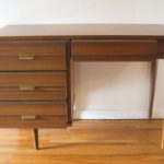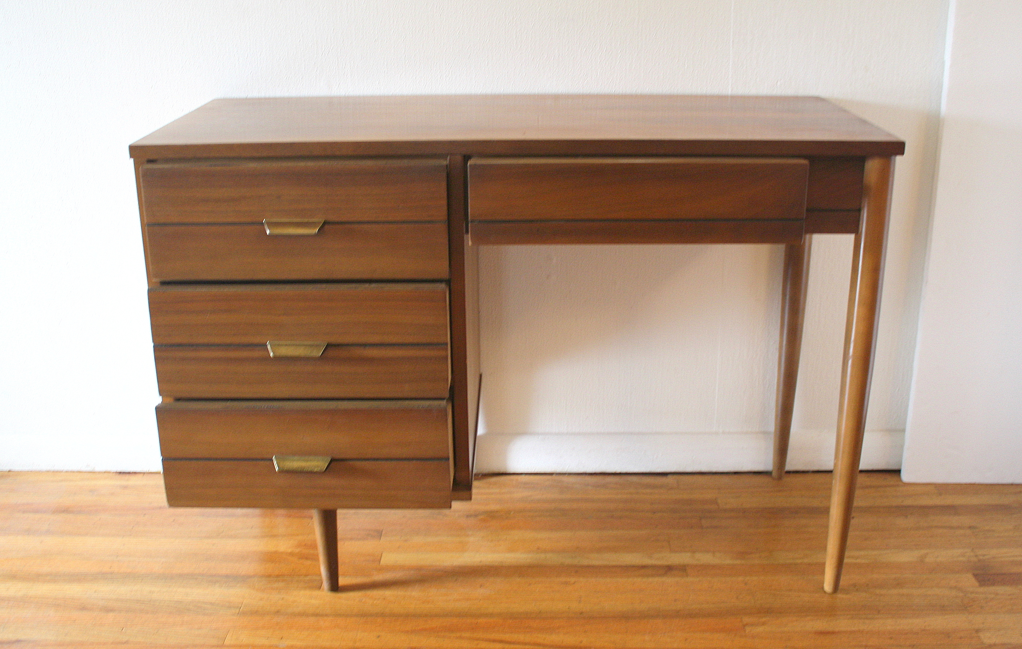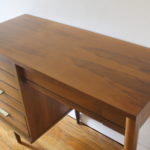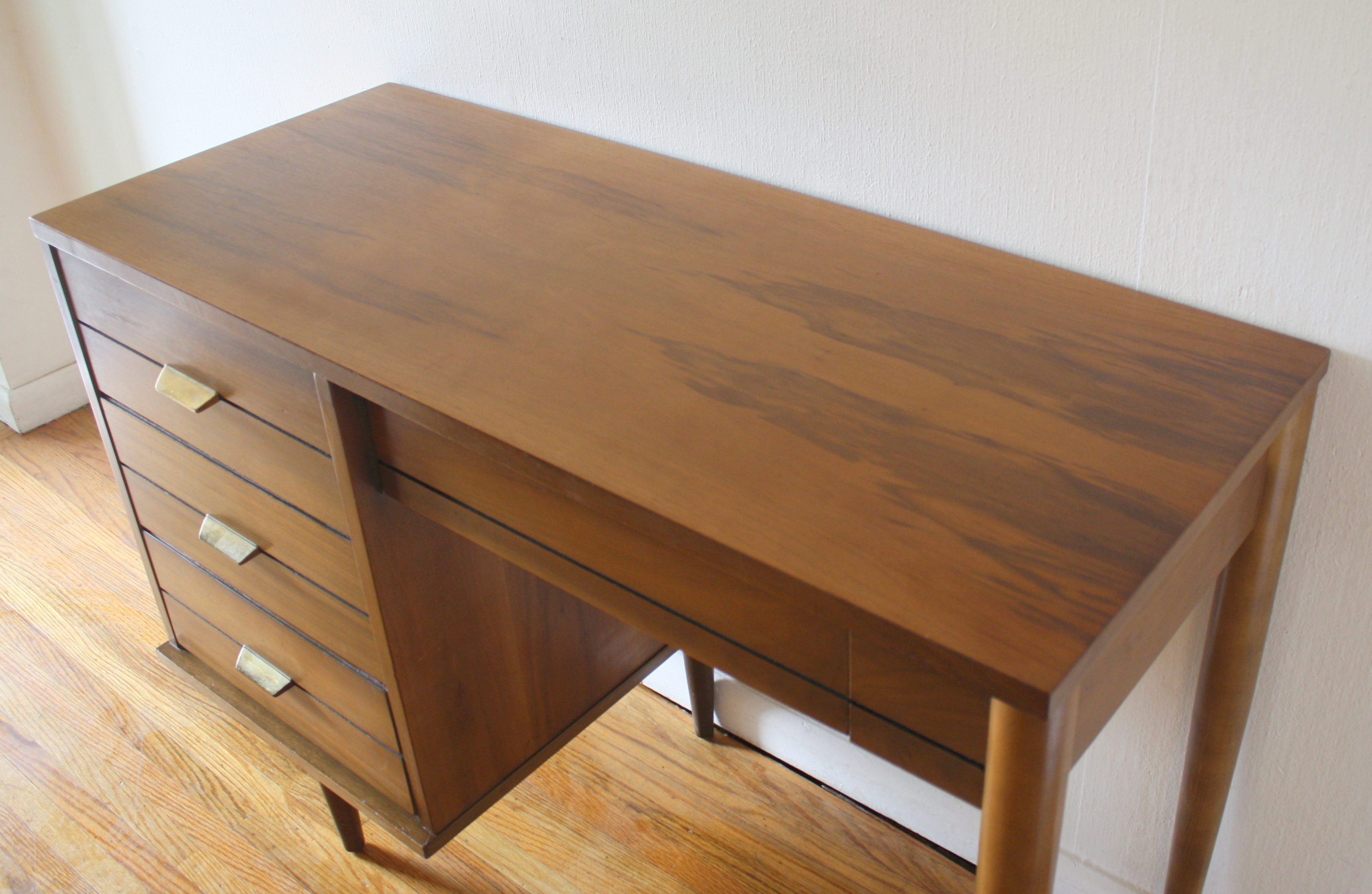 This is an asymmetrical mid century modern desk with 4 dovetailed drawers with handsome brass pulls, tapered legs, and a beautiful wood grain.  Dimensions: 44″W x 18″D x 30.5″H.