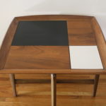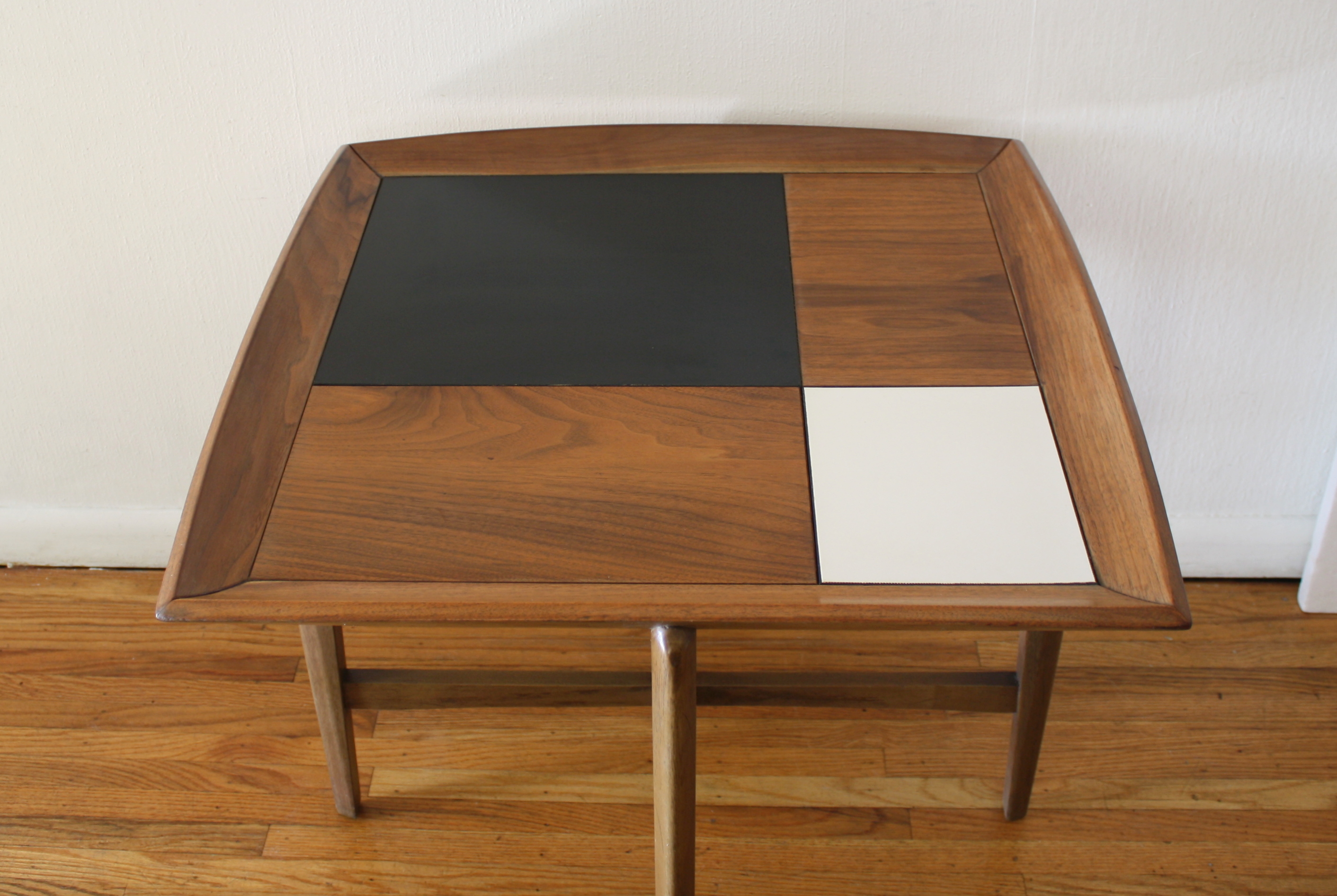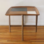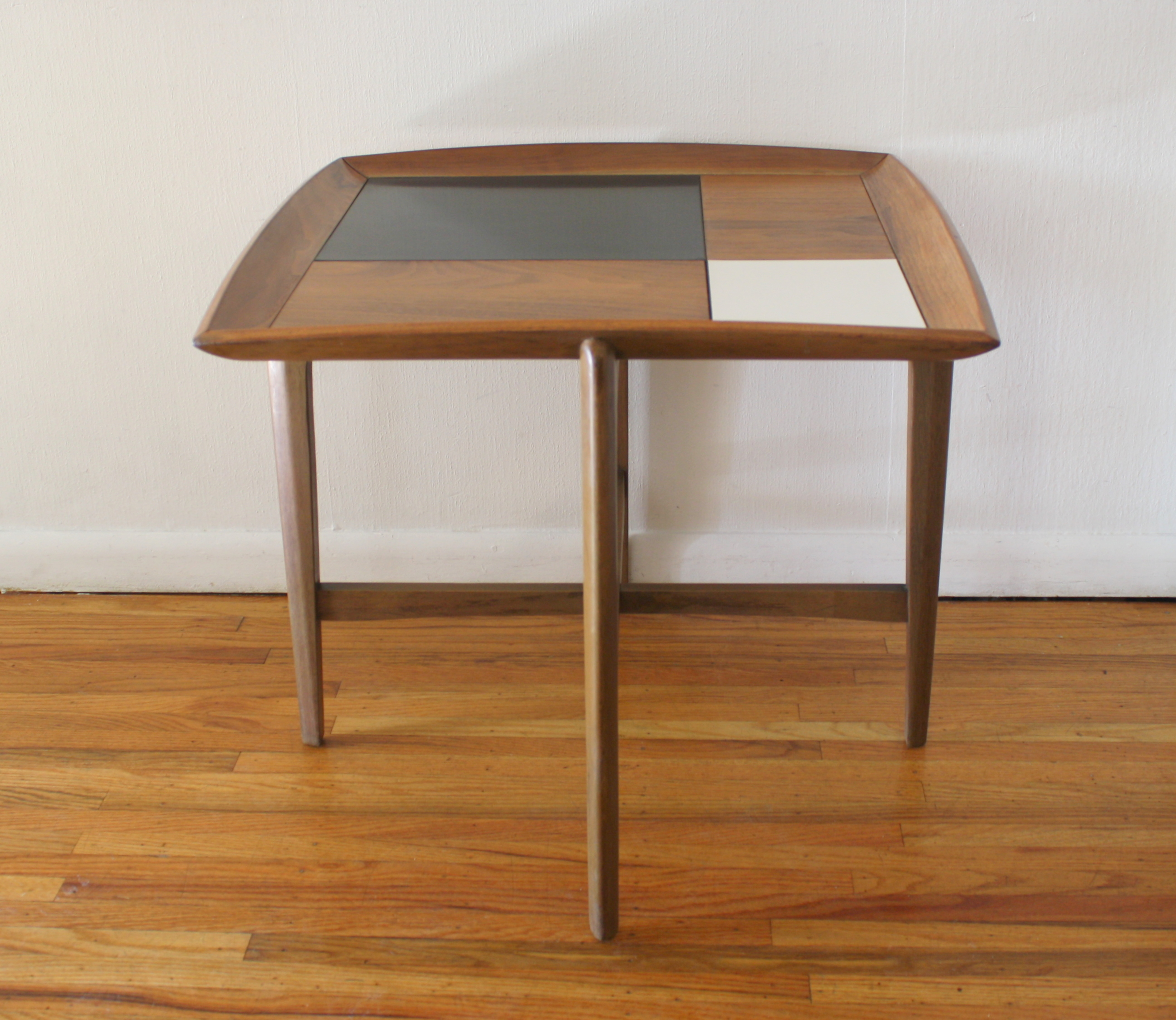 This is a mid century modern side end table with a floating cross base and square top.  In the table top’s design there are 2 mod inlaid black and white formica tiles.  Dimensions:  26″W x 26″D x 23″H.