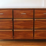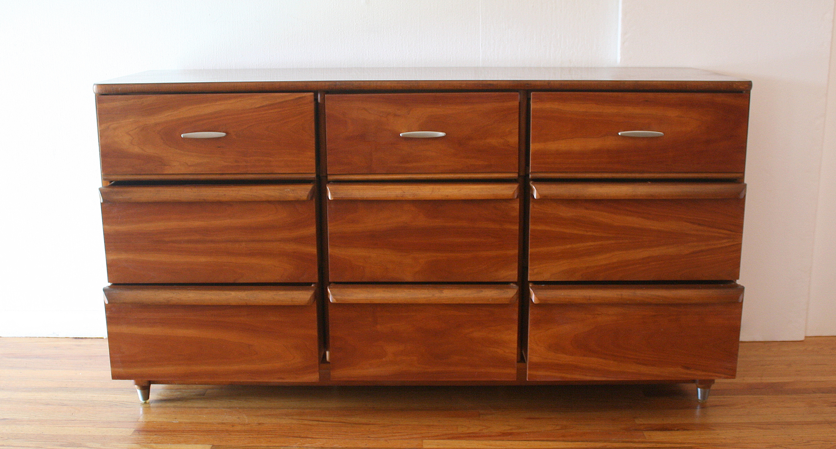 Mid Century Modern Low Dresser Credenza This is a mid century modern low dresser credenza with a gorgeous wood grain. It has 9 dovetailed drawers with metal pulls and a streamlined design The tapered legs are lucite tipped and wrapped with metal. Dimensions: 60”W x 19”D x 32”H. *SOLD*