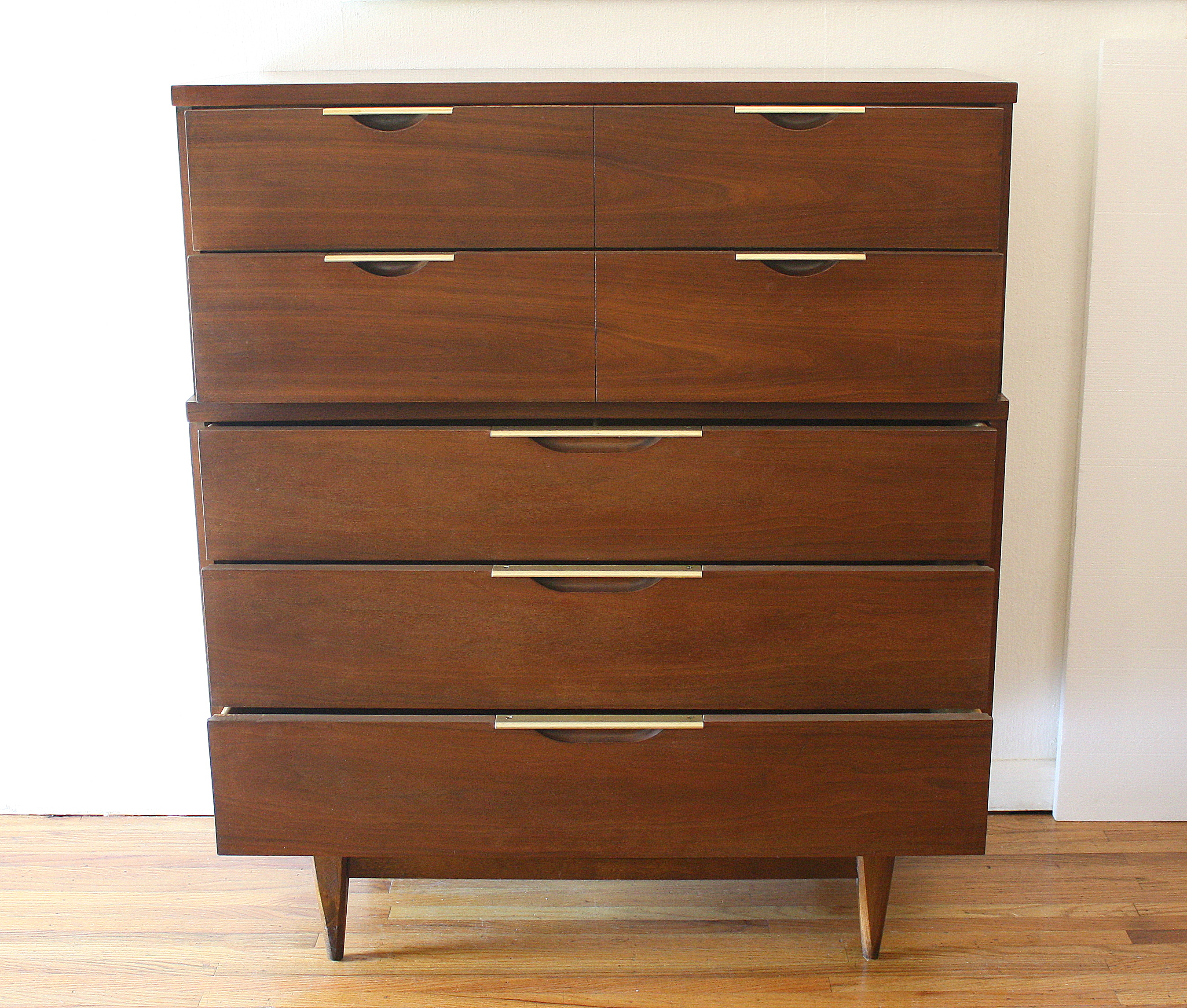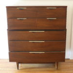 Mid Century Modern Tall Dresser by Kent Coffey This is a mid century modern tall dresser from Kent Coffey’s Tableau series. It has 5 dovetailed drawers with their signature streamlined brass pulls, arched base with tapered legs. Dimensions: 40″W x 17.5″D x 46″H. *SOLD*