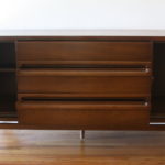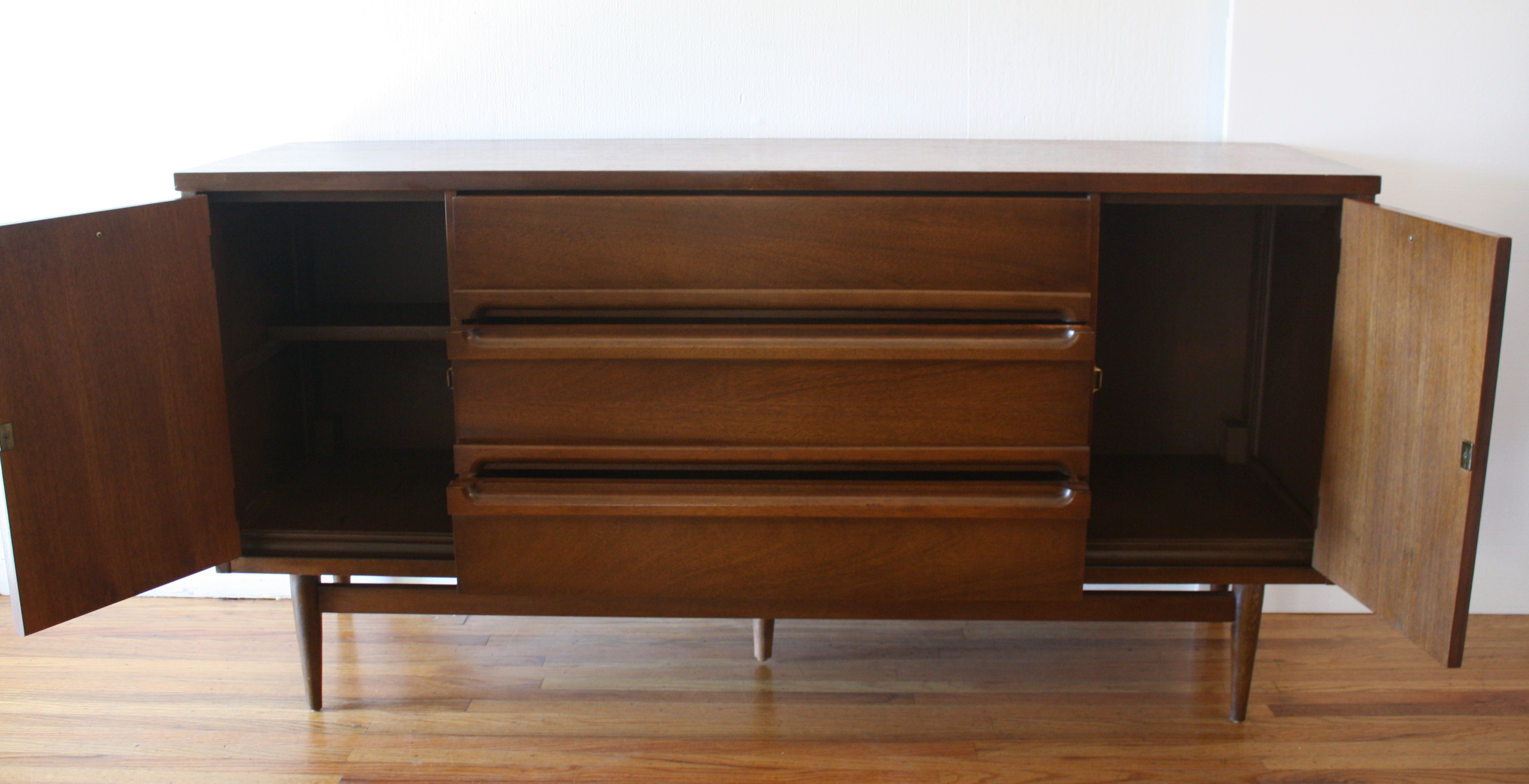 Mid Century Modern Bassett Credenza This is a mid century modern credenza by Bassett. It has 3 streamlined drawers, 2 side cabinets, and a floating base with tapered legs. The dimensions are: 60”w x 18”D x 30”H. *SOLD*