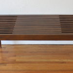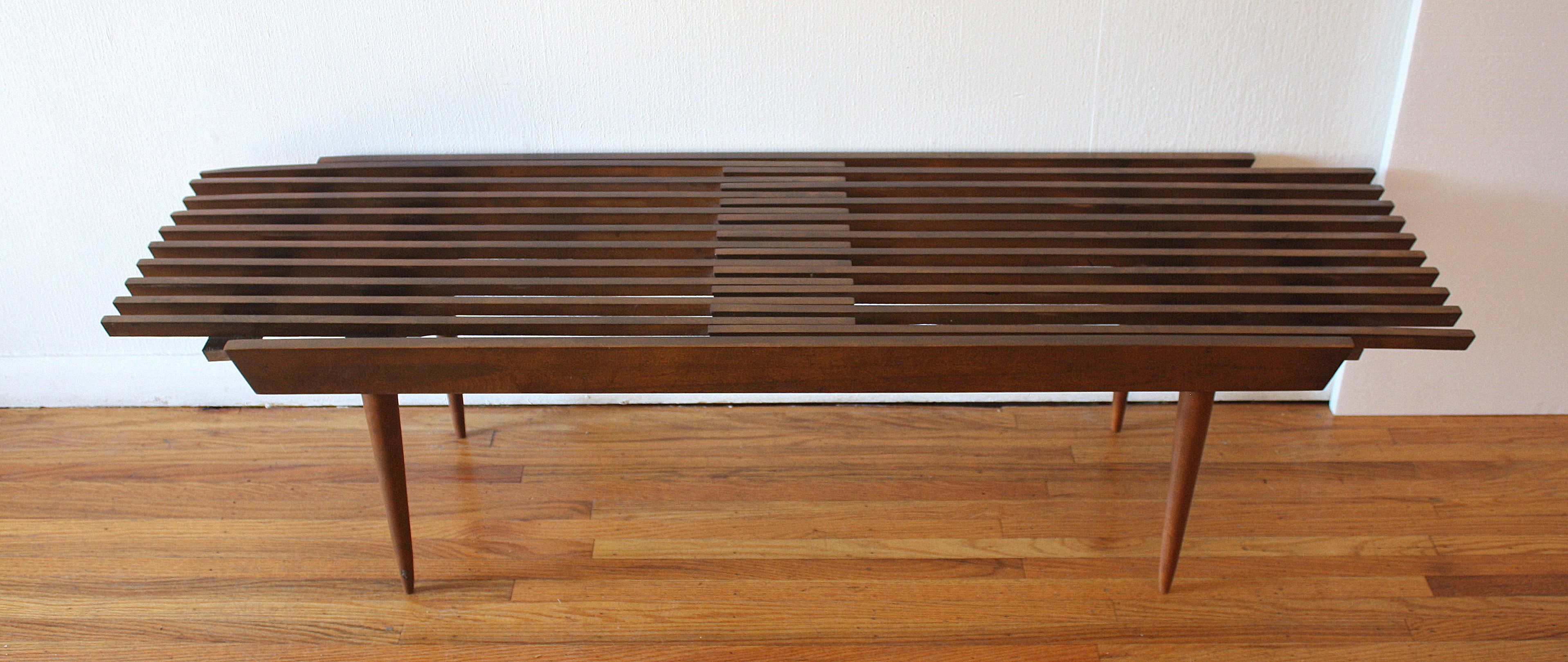 This is a mid century modern coffee slatted coffee table bench with an extending design and tapered legs. Dimensions: 48″W closed, (can extend to any desired width to a maximum of 60″W open) x 18″D x 16″H.