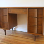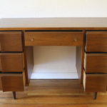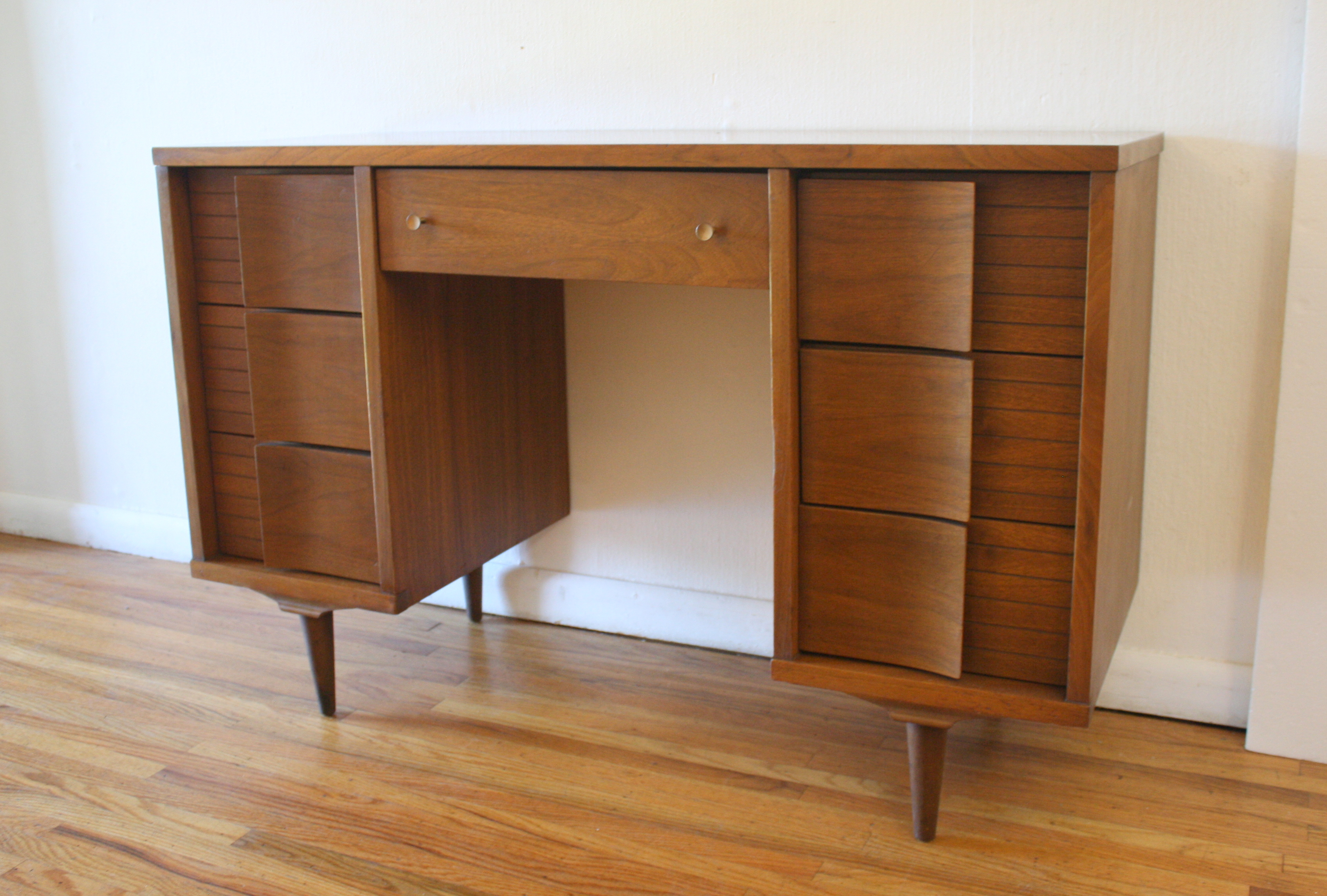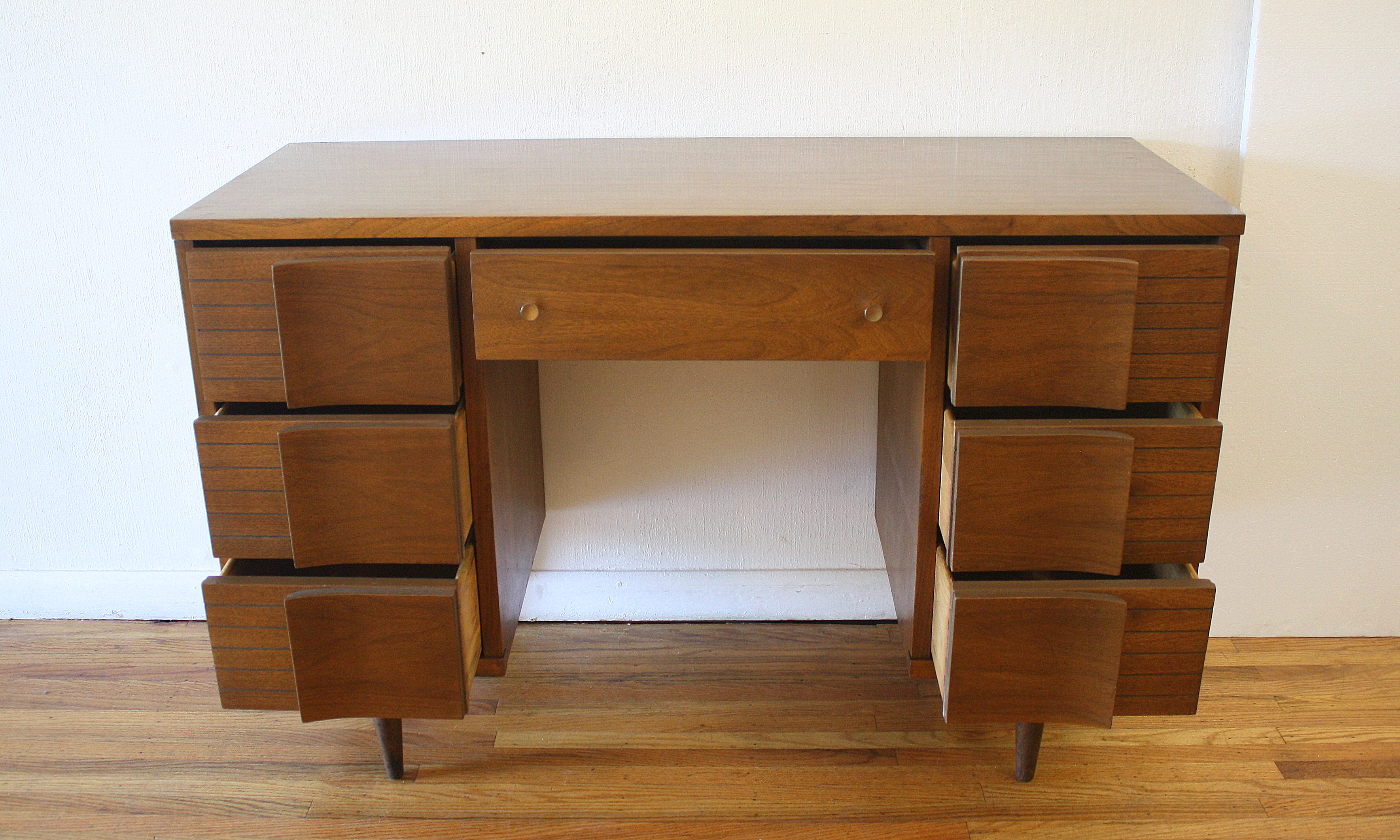 Mid Century Modern Desk by Johnson Carper This is a mid century modern desk by Johnson Carper. It has 7 dovetailed drawers with their signature concave design, and tapered legs. Dimensions: 46″W x 18″D x 30″H. *SOLD*