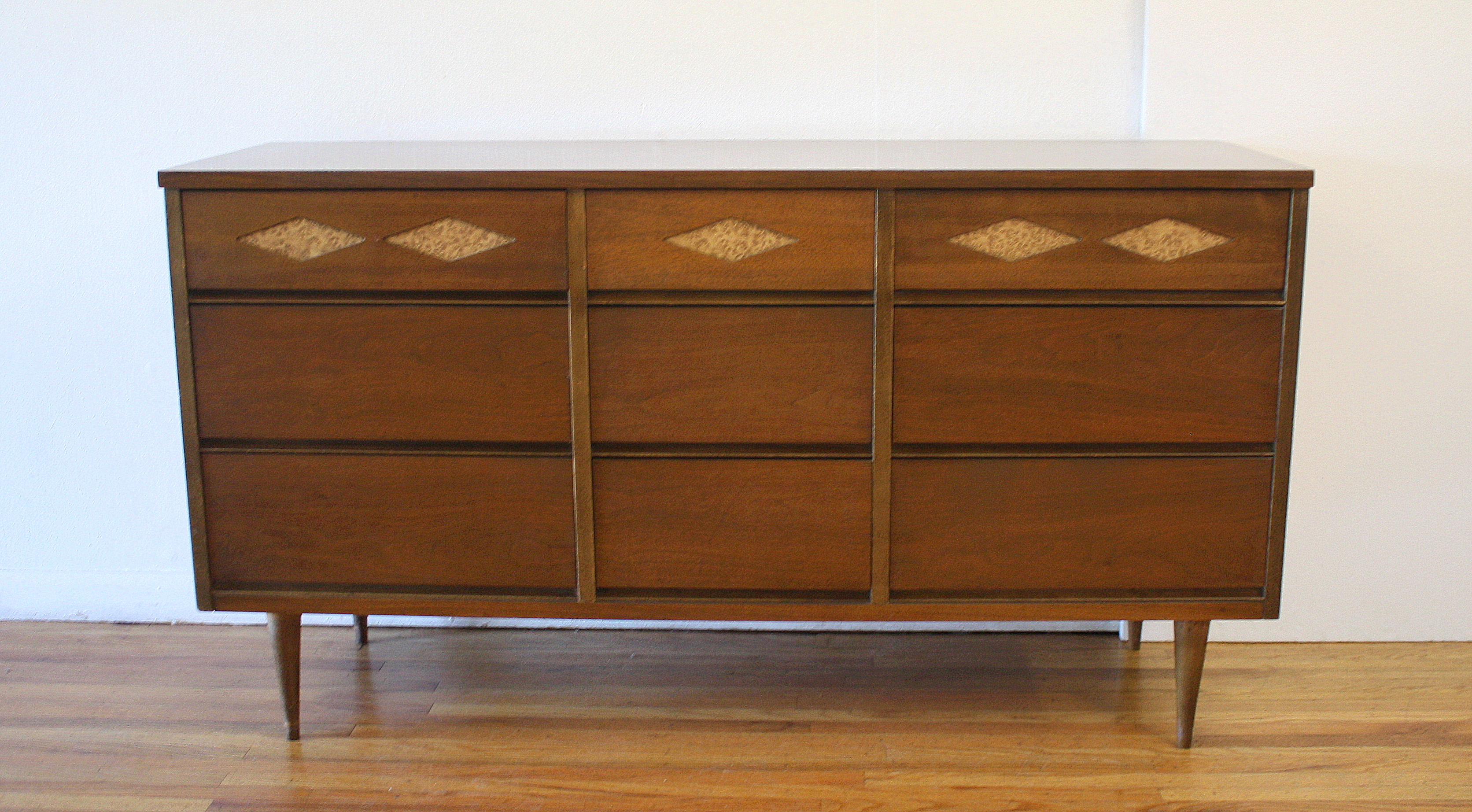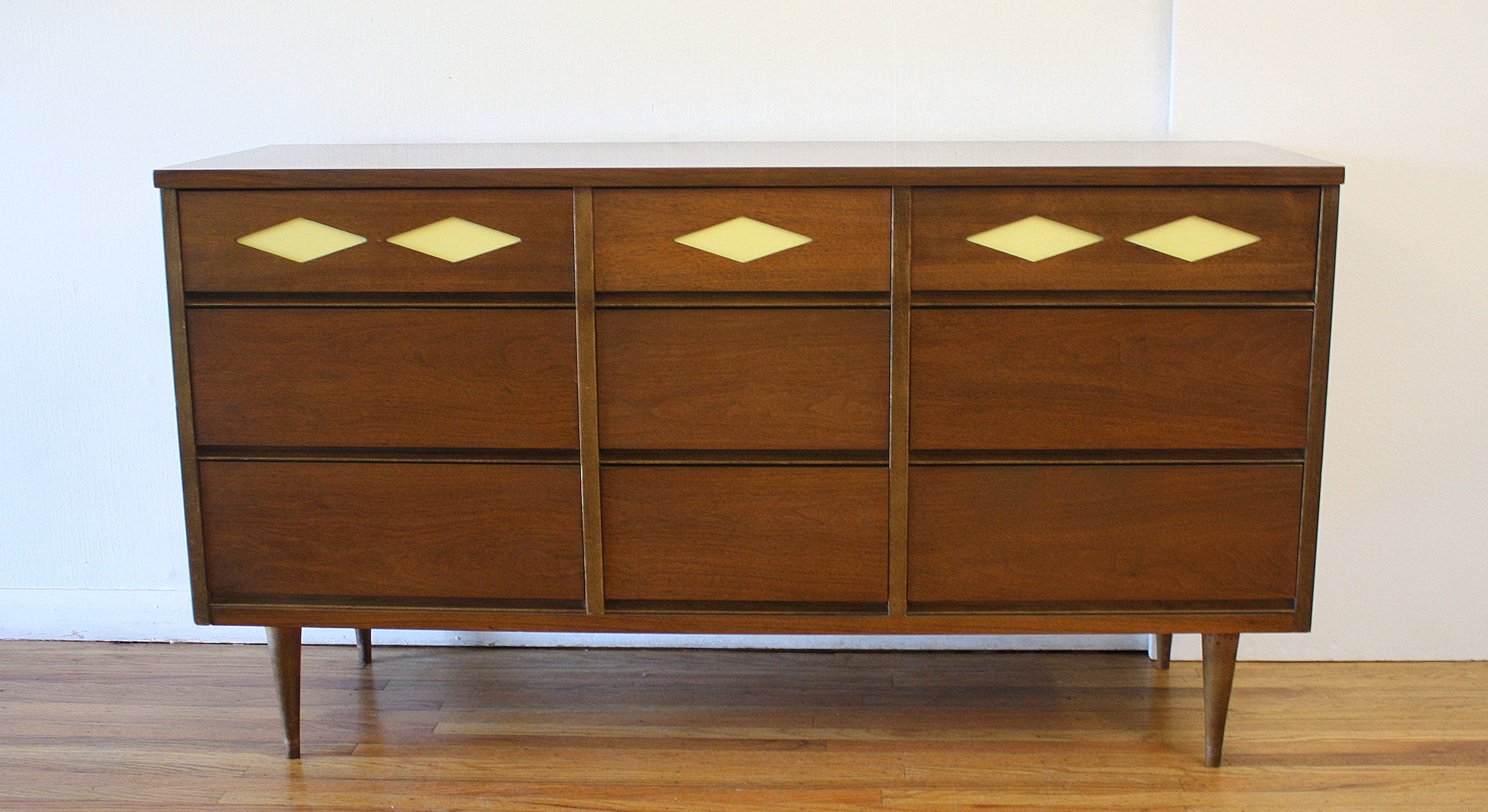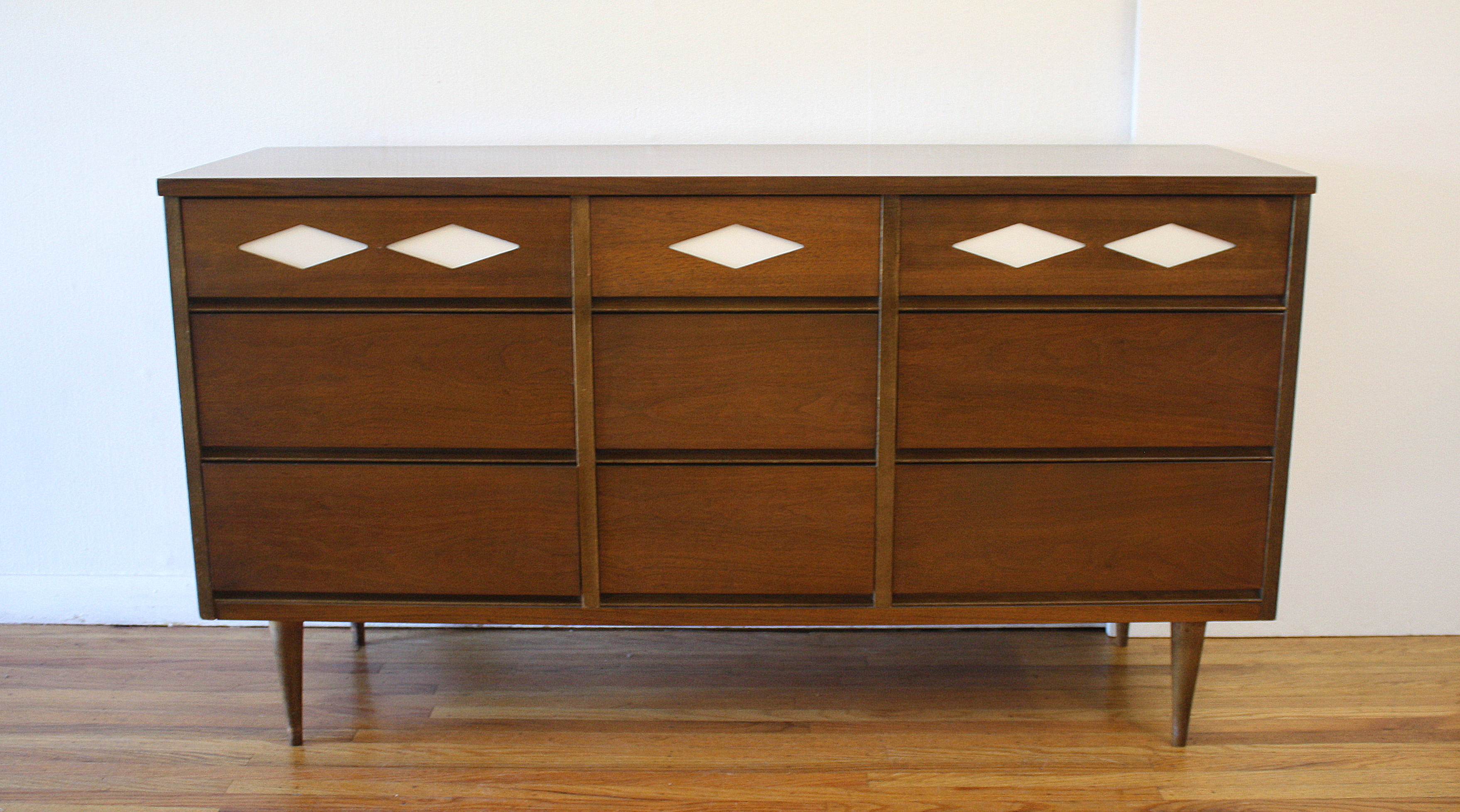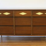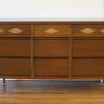 This is a mid century modern low dresser credenza by Bassett. It has 9 dovetailed drawers and tapered legs. Special feature: The top 3 drawers have diamond cut outs that different colored inserts can be interchanged: turquoise, mod white, yellow, and burl. Dimensions: 56″W x 18″D x 31″H.