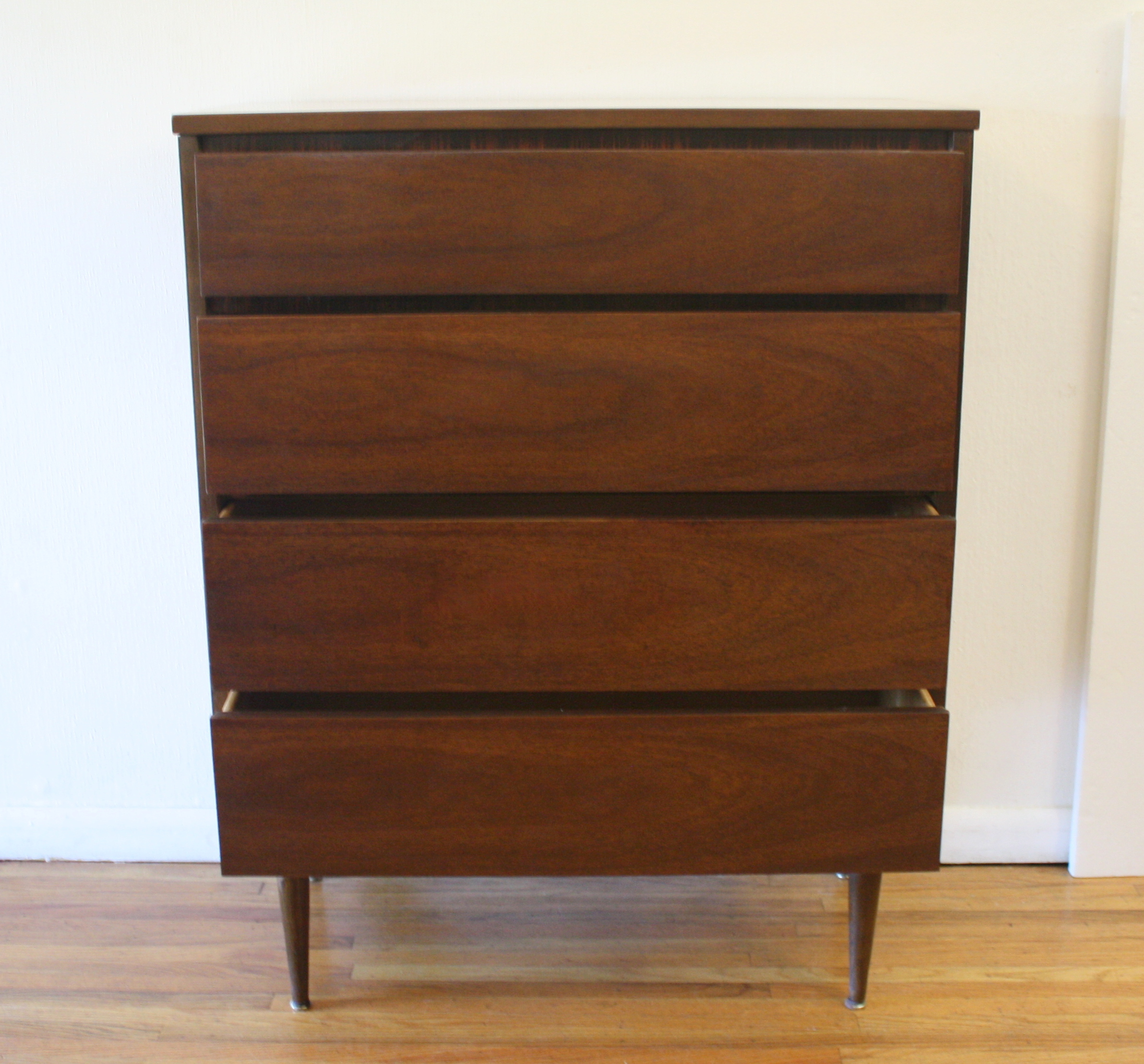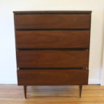 Mid Century Modern Tall Dresser by Bassett This is a mid century modern tall dresser by Bassett. The first has a streamlined drawer design, faux rosewood accents, and tapered legs. Dimensions: 34″W x 18″D x 43.5″H. *SOLD*
