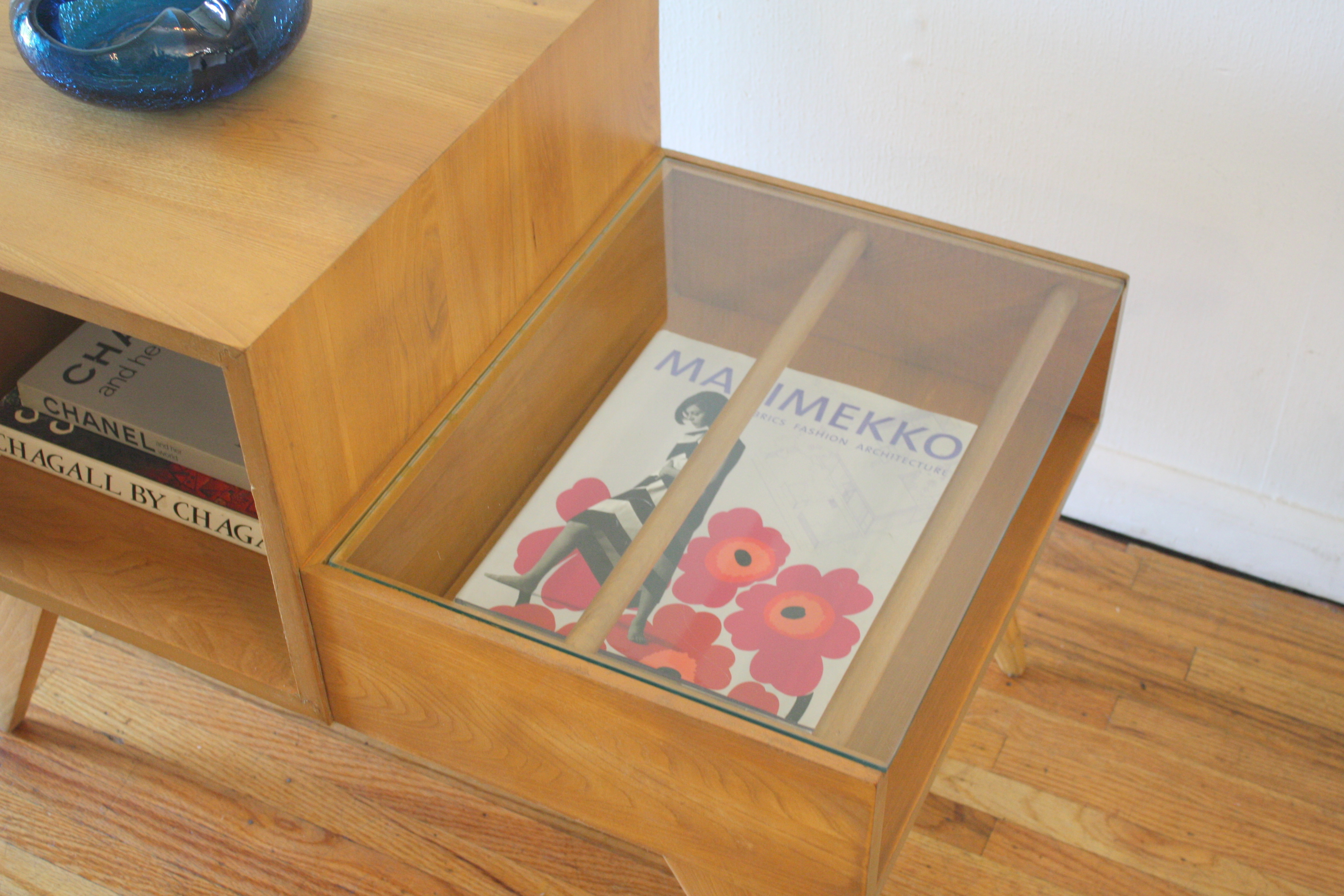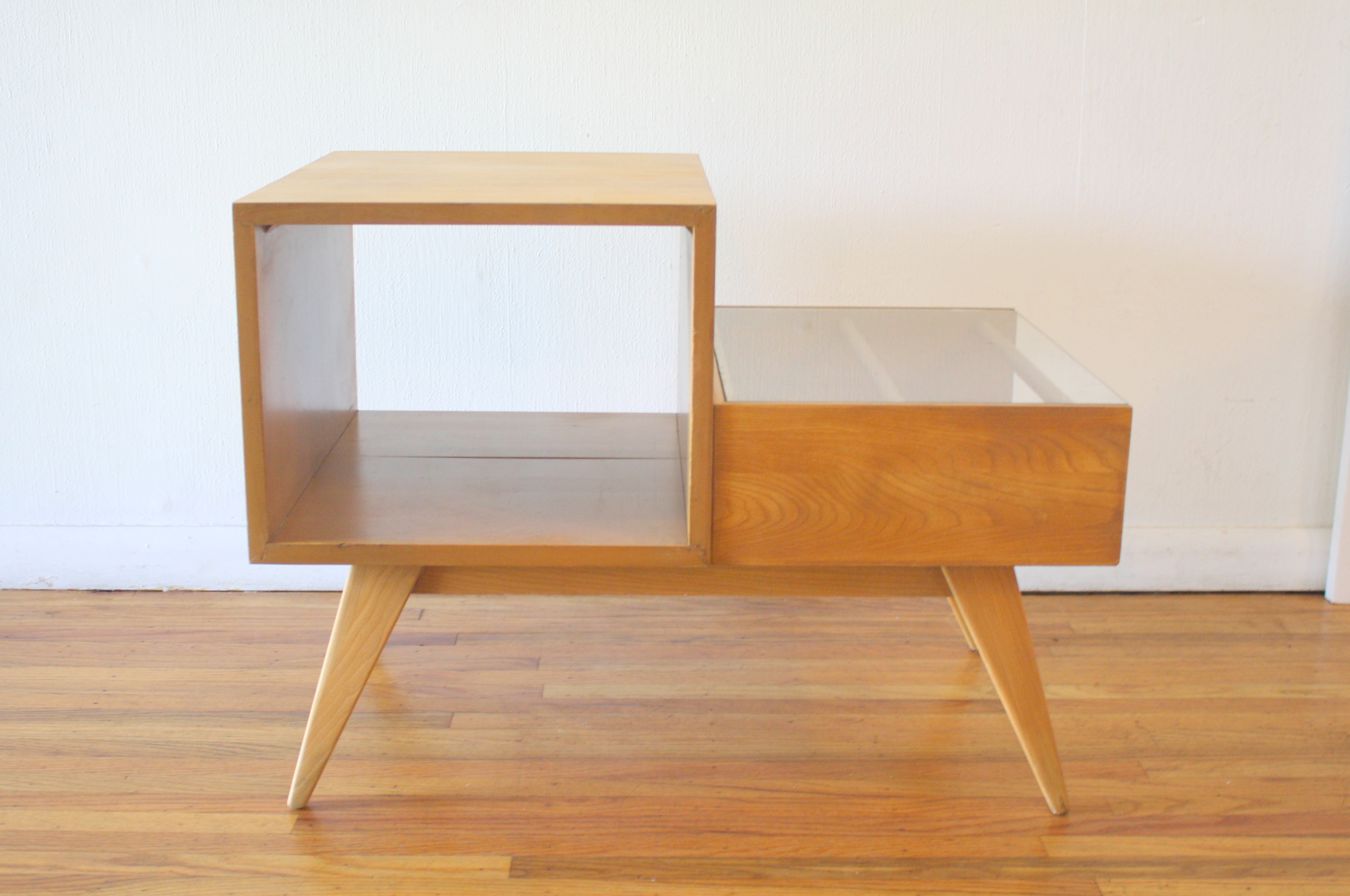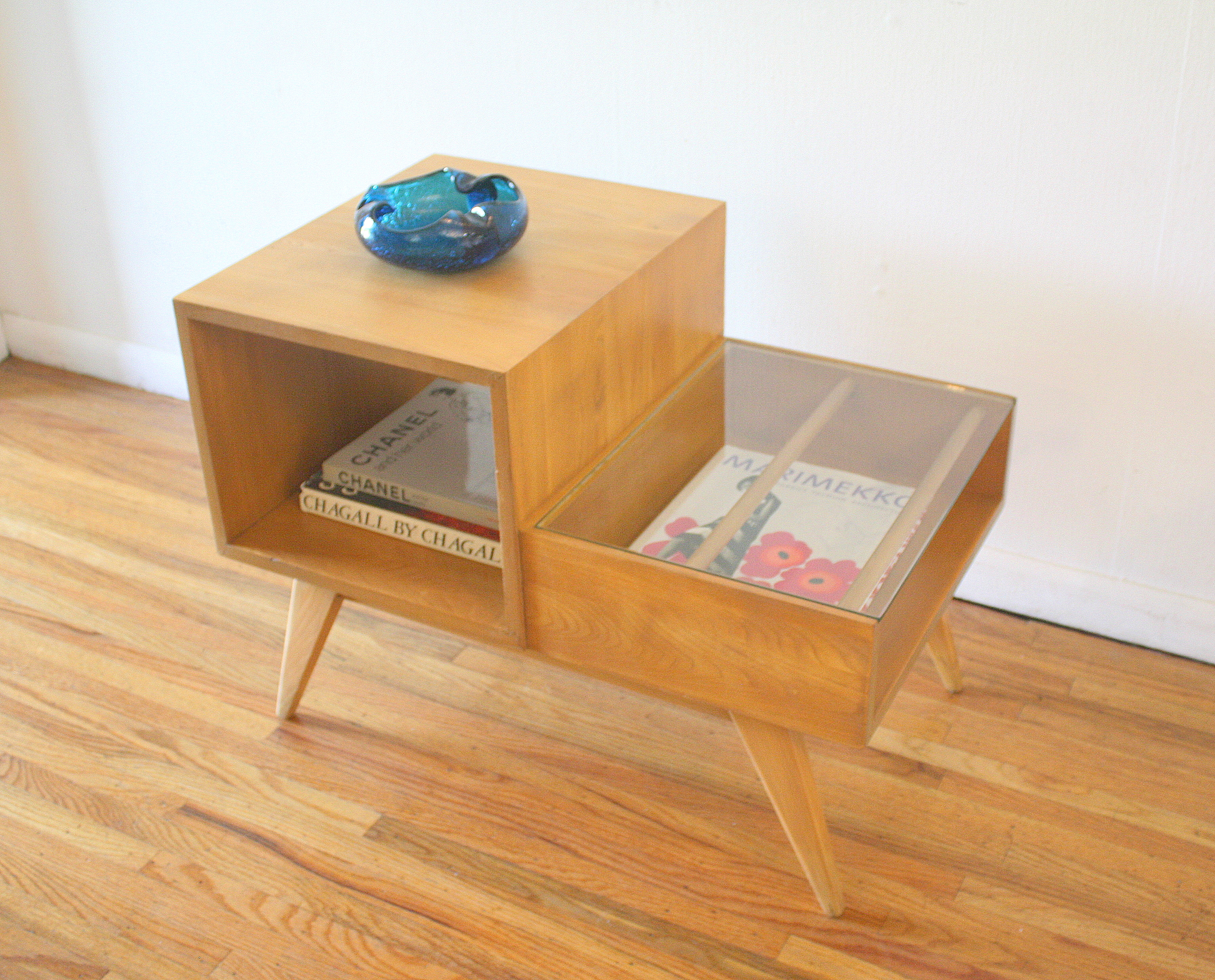 This is a mid century modern 2 tiered table with a glass topped magazine shelf, cubed shelf, and splayed legs.  Dimensions: 30.5”W x 19”D x 16”H lower tier x 22.5”H higher tier.  Accessories sold separately.mcm 2 tiered table with magazine shelf 1.JPG