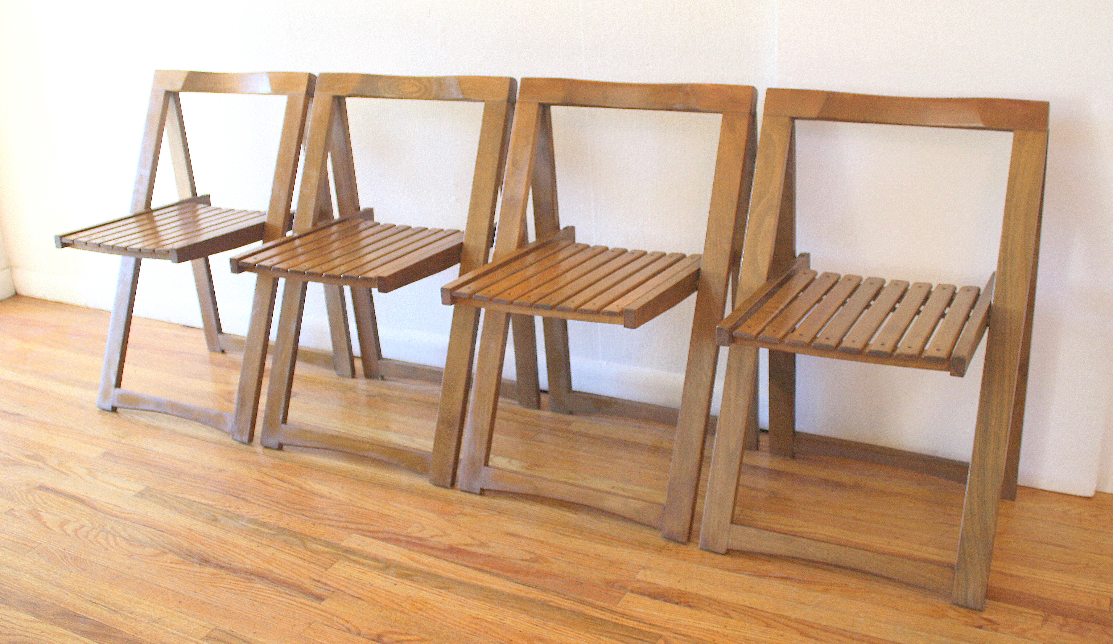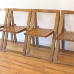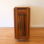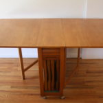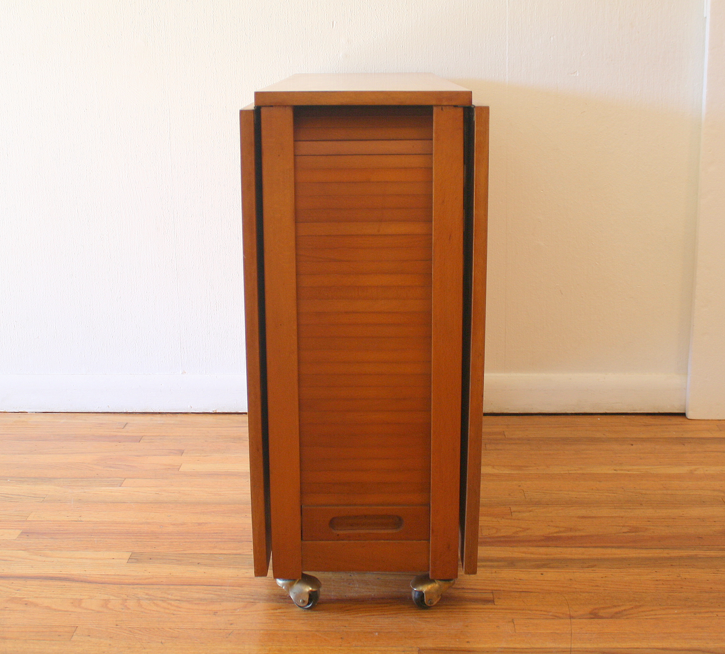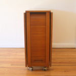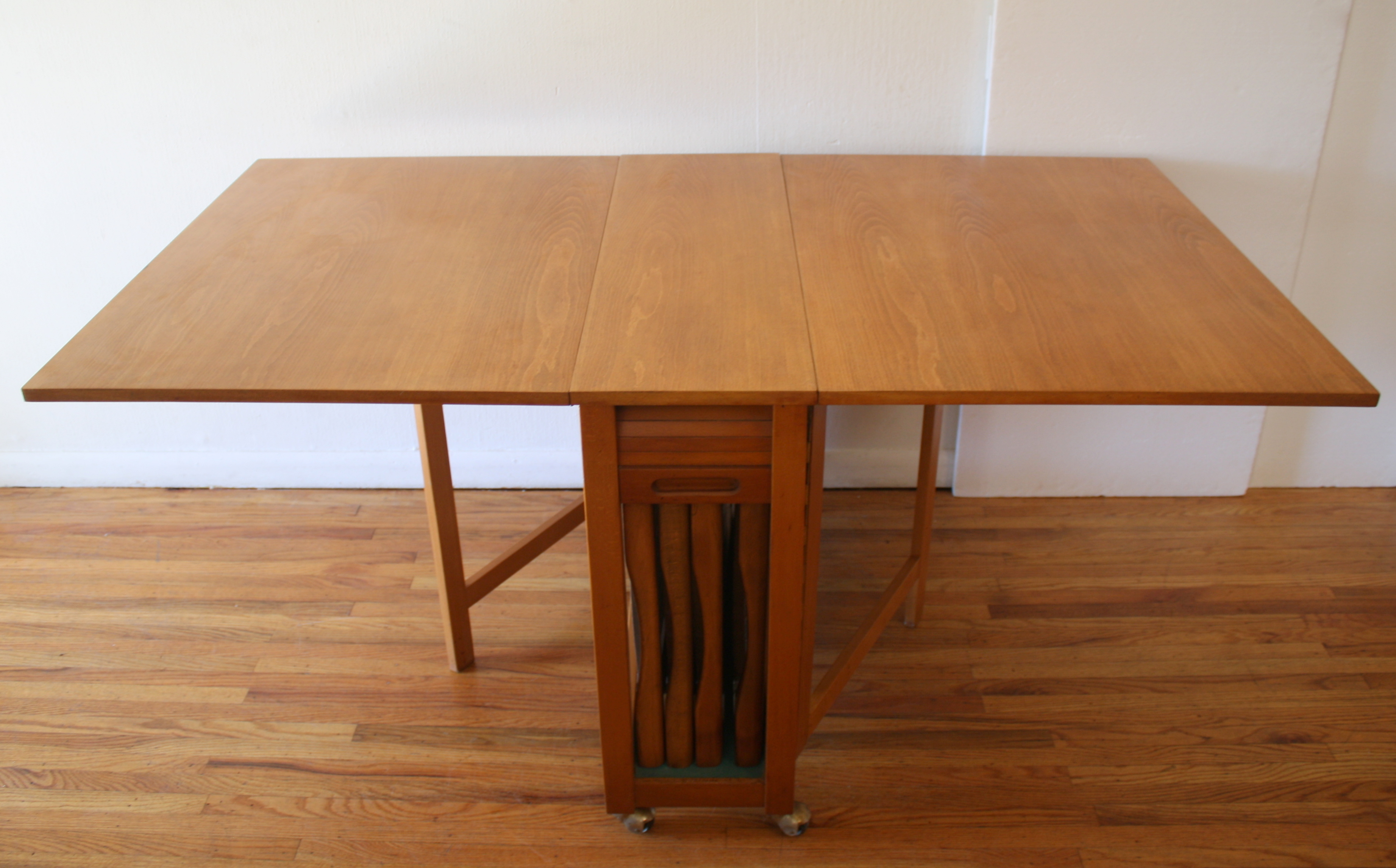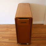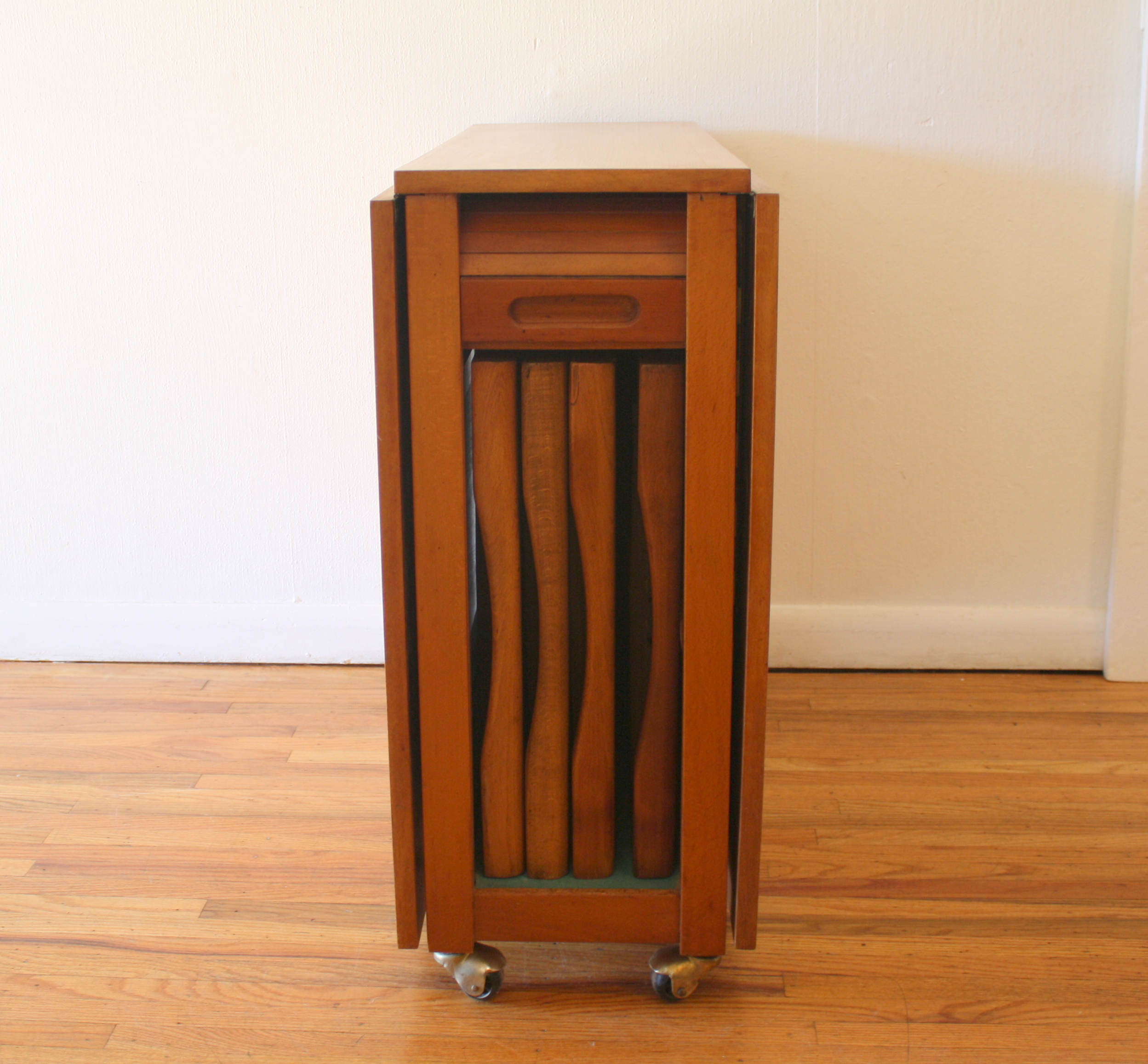 This is a mid century modern gateleg table with 2 folding extension leaves and 4 folding chairs. The table has a tambour door that rolls up to store the chairs. The folding leaves extend and are supported by the gatelegs that swing open under the table. Perfect for small spaces, and extra serving space. It is easy to store, and rolls on wheels for easy transport.  There is a small utility drawer on the back.  Table dimensions: 62″W (both leaves unfolded up), 12.5″W leaves folded down, 34″D, 29″H. Chair dimensions: 14.5″ seat width, 14.5″ seat depth, 17″ seat height, 28.5″ back height. Accessories sold separately.