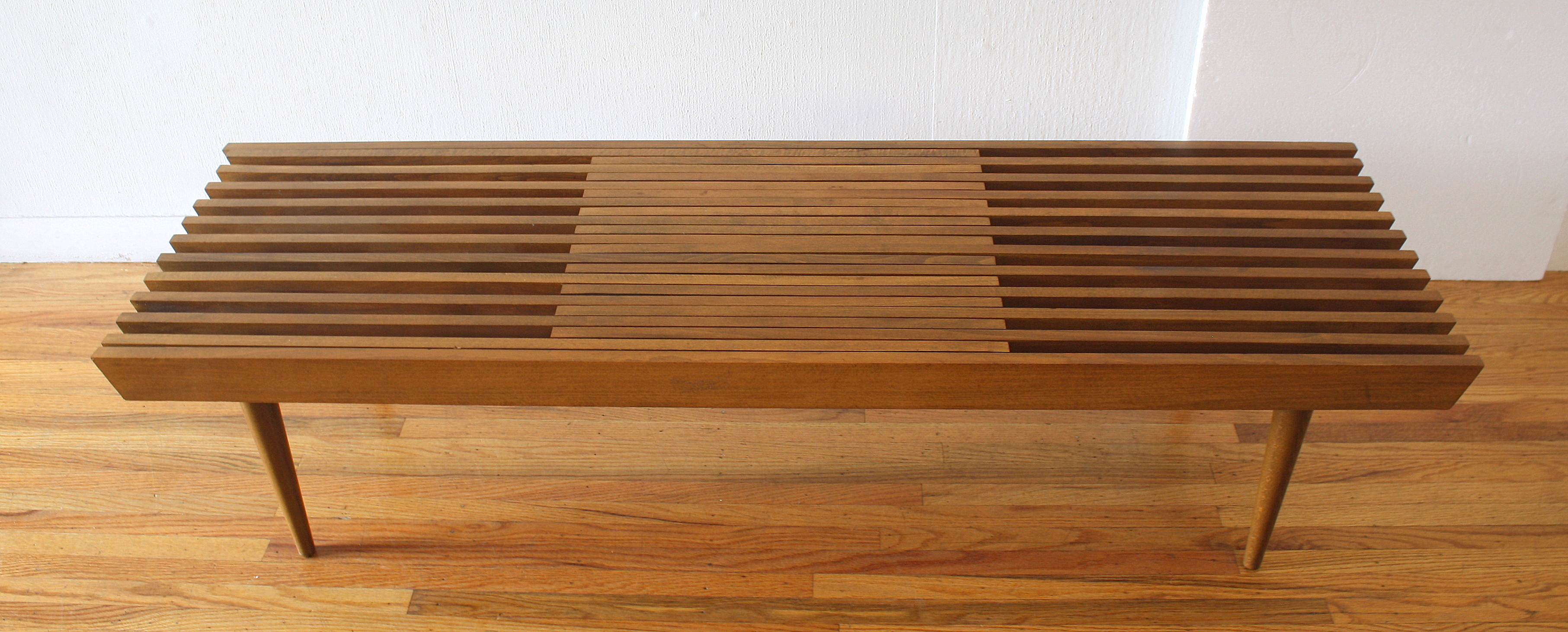This is a rare mid century modern slatted coffee table bench with an angled design, extending sides, and tapered legs. Dimensions: (Closed) 58.5″W, (open) 72″W x 18″D x 14″H.