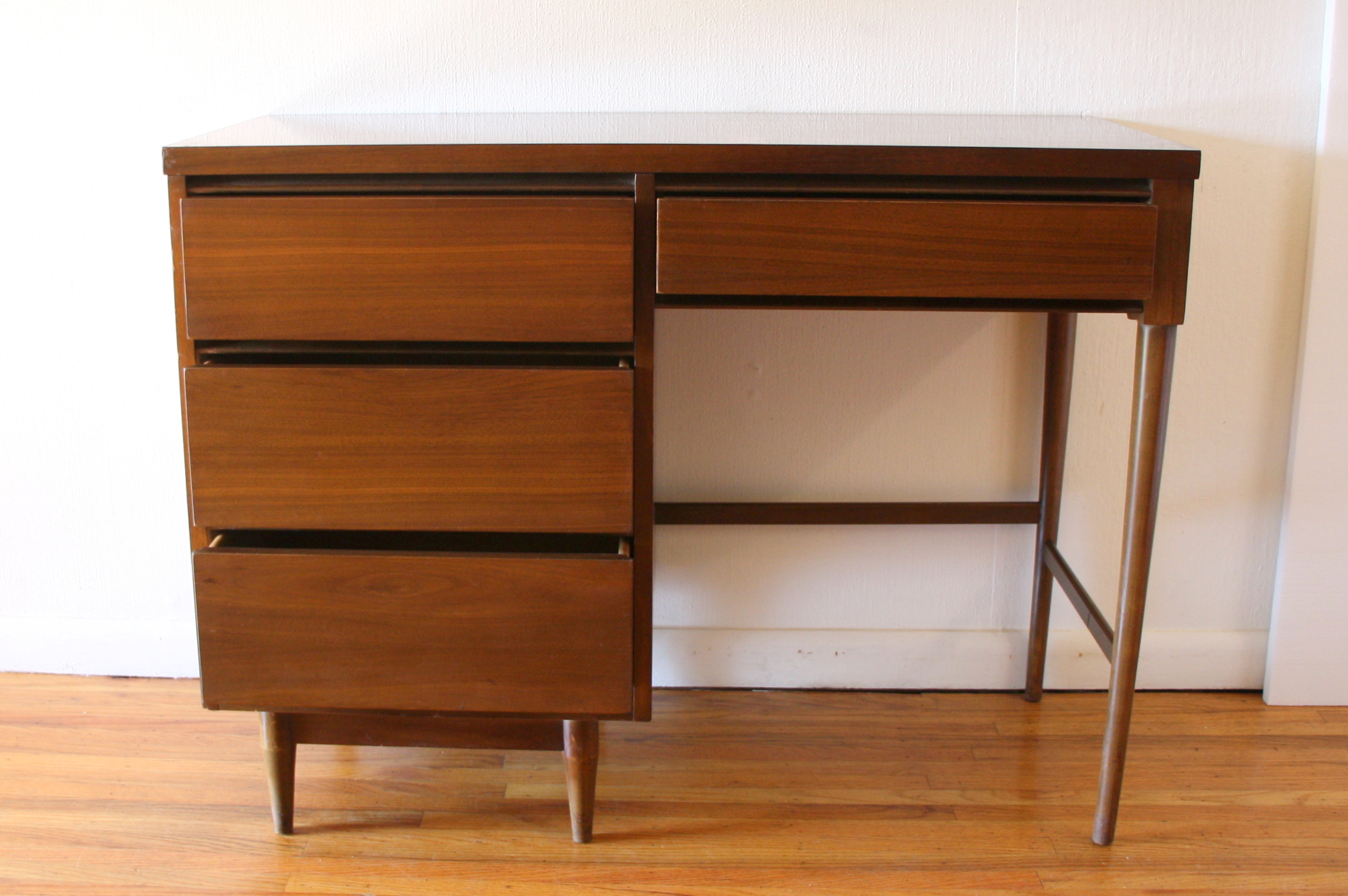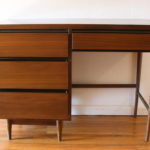Mid Century Modern Desk This is a mid century modern desk with 4 dovetailed drawers with a clean streamlined design and tapered legs. Dimensions: 42″W x 18″D x 31.5″H. *SOLD*