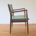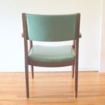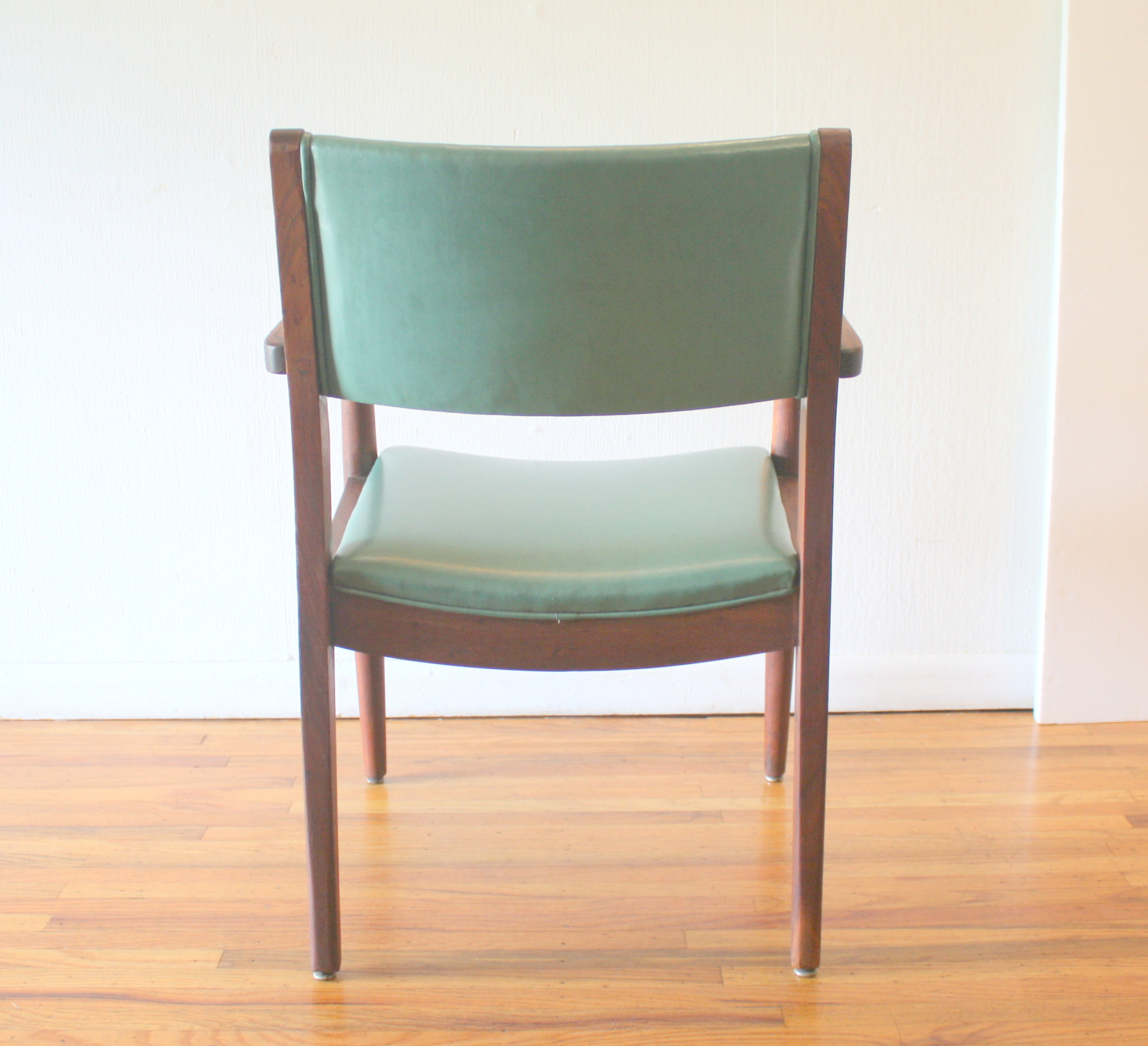This is a mid century modern arm lounge chair with a solid wood frame and tapered legs, upholstered in turquoise naugahyde. Dimensions: seat width: 18.5″, seat depth: 19″, seat height: 17.5″, back height: 31″.
